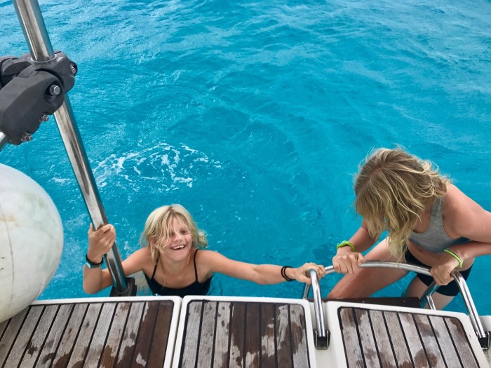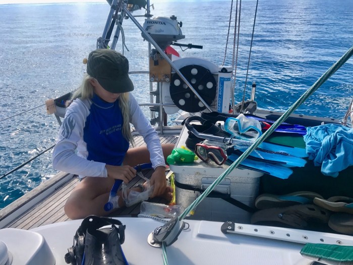Gegen späteren Nachmittag wollten wir nochmals schnorcheln gehen. Wir hatten vor, im Pass (der Durchfahrt in das Riff) mit der eingehenden Strömung uns treiben zu lassen. In den Tuamotus haben wir das erste mal davon gehört, dass Leute das machten und es tönte verlockend. Damals hatte sich aber für uns keine Gelegenheit ergeben. Wir fuhren also mit dem Dinghi und einer langen Leine daran, gegen die einlaufende Strömung durch den Pass in Richtung Ausgang. Dort hüpften wir aus dem Beiboot und liessen uns wieder ins Atoll hineintreiben! Es war ein kurzer Spass, bald schon waren wir wieder drin und weils so schön war, machten wir es gleich nochmals! Danach fuhren wir noch ein Stück weiter zu einem andern Riff. Dort schwamm dann majestätisch ein Weissspitzen-Riffhai unter uns durch. Neele war sowieso im Beiboot geblieben und Lenja hatte nach der Begegnung keine Lust mehr zum Schnorcheln! Verständlich. Zudem wurde es auch langsam kühler. Die Winterzeit hier in Queensland machte sich bemerkbar mit der Dämmerung, die schon um 17. Uhr beginnt. An diesem ruhigen, sonnigen Tag waren wir noch auf dem Boot «Taka OA» mit Debi und Jono zu einem Sundowner eingeladen. Wir haben sie bereits in Sydney getroffen und unsere Wege werden sich nun immer wieder kreuzen. Wir werden auch zusammen in der Indonesien Rally sein!