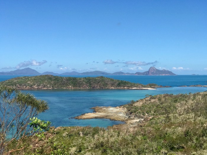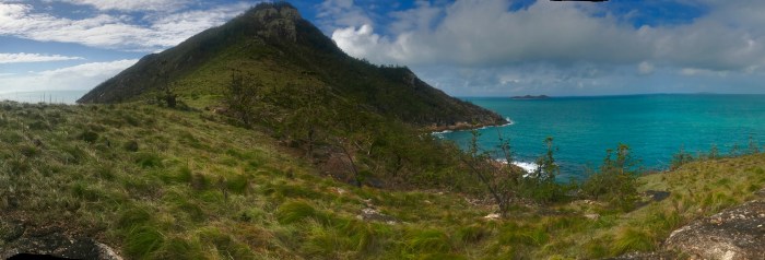 Am nächsten Tag war der Wind war geradezu perfekt für die kurze Überfahrt zur Border Island. Auf Border Island hatte ich mich schon die ganze Zeit gefreut, hatte sie doch ein tolles Riff in der Ankerbucht. Als wir ganz praktisch an einer der freien Mooringbojen festgemacht hatten, machten wir uns aber zuerst auf zum Strand. Die Border Island hat fast die Form eines Herzes und die Bucht ist der Einschnitt des Herzens… auf beiden Seiten der Bucht stieg die Landschaft an und in der Mitte schien es ganz leicht zu sein, den flachen Hügel zu erklimmen um auf die andere Seite zu schauen. Wie auf fast allen Whitsunday Inseln gibt es keinen Weg und wir stampften zwischen grossen büschelartigen Gräsern vorbei in die Höhe und ich hoffte inständig, keinem Schlangentier zu begegnen…! Die Aussicht die wir dann aber von da Oben genossen war umwerfend schön. Wieder zurück am Strand konnte ich die tollsten Muscheln finden. Das erstaunliche ist, dass es auf jeder Insel andere Muschelarten zu finden gibt.