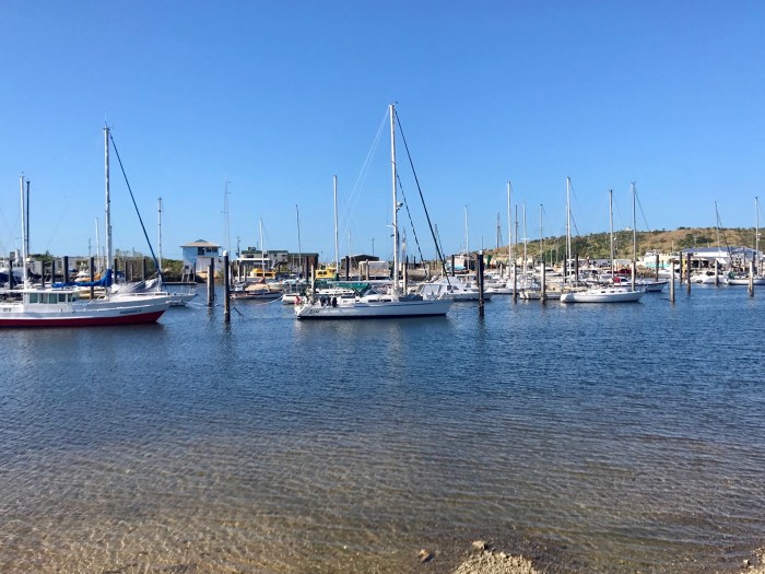 Die Fische waren nicht mehr zu sehen in der nächsten Bucht, doch wir hatten da eine Mooringboje die hielt! Der Grund zum Ankern wäre sehr tief gewesen, so waren wir froh darüber. Unterdessen war auch schon wieder ein paar Tage Starkwind mit heftigen Regenfällen vorhergesagt. Wir entschieden uns von der Hook Island nach «Bowen» zu segeln. Bowen liegt zu zwei Seiten am Meer und wir planten vorerst an der Nordostküste zu ankern. Doch die Idee zwei drei Tage auf dem Boot bei Schlechtwetter und Starkwind festzusitzen machte uns nicht an. Noch unterwegs versuchten wir Informationen über den «Bowen Boat Harbour» zu bekommen. Es gab keine Marina aber einen Bootshafen, wo man zwischen zwei Pilonen wie in Brisbane angetroffen, festmachen konnte. So waren wir näher am Land und konnten auch mal vom Boot!