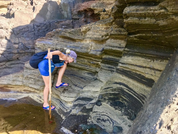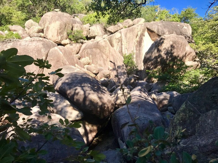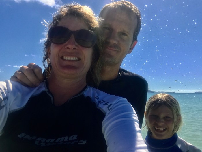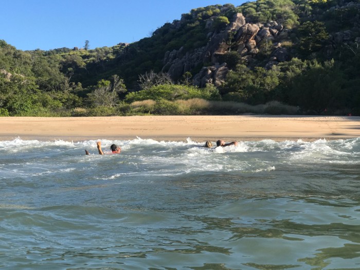 Beeindruckt klettern wir danach wieder den Weg zum Wasser runter. Wir wollten uns noch ein wenig mehr umsehen. Zuhinterst in der Bucht lag ein grosses Motorboot auf den Steinen. Zeuge des Zyklons Debbie… Es sass hinter grossen Felsen und hinter Mangrovenbüschen, die Wellen mussten enorm gewesen sein zu diesem Zeitpunkt. Wir entfernten uns danach wieder von dem traurigen Anblick und machten uns auf die Suche nach dem Wasserfall, der auch irgendwo da sein musste! Das Beiboot mussten wir bei dem steinigen Ufer ankern und kletterten über die Felsbrocken in die Höhe wo wir den Wasserfall plätschern hörten. Darunter gab es ein tiefes, schmales Becken wo wir uns an diesem sonnigen, warmen Tag genüsslich hineinsetzten. Die Kinder kletterten noch ein Stück den Wasserfall hoch und liessen sich duschen! An solchen Orten kommen bei allen von uns immer Gefühle hoch, im Paradies gelandet zu sein!