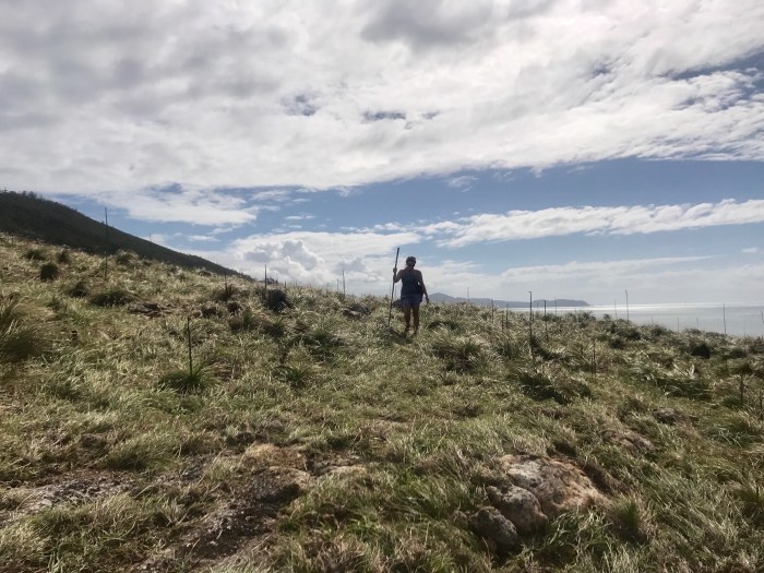 Wir klettern über hohe Grasbüschel auf den Hügel auf der Border Island