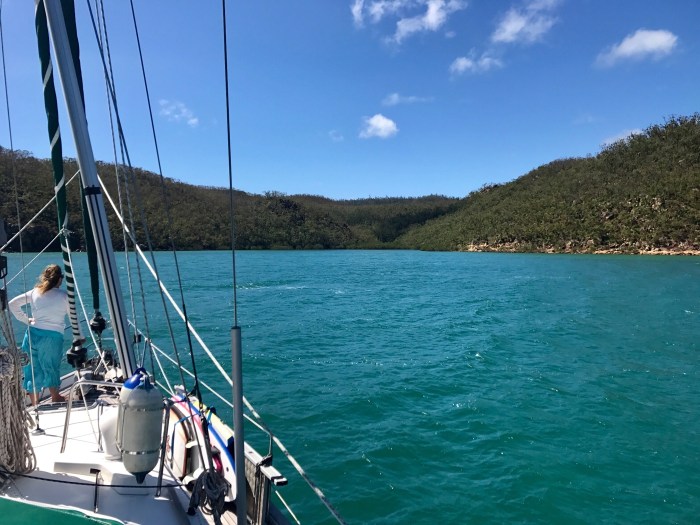 Port Clinton war von unserer Position nur etwas mehr als vierzig Seemeilen entfernt, also ein Katzensprung. Es war ein sonniger Tag und wir hatten guten Wind von hinten und kamen mit ausgebaumter Genua gut voran. Das Wasser an der Küste war erstaunlich weisslichgrün, erinnerte mich an Gletscherwasser. Unterwegs beschlossen wir noch ein Stück weiter nördlich zu segeln, und nicht im Fluss (bei den Krokodilen) zu ankern, sondern hinter zwei Inselchen in einer Bucht am Festland, in der Pearl Bay. Wir motorten zwischen den Inseln durch, was sehr interessant war. In der Bucht lag schon ein Katamaran und so wie wir sehen konnten, war der ziemlich am Schaukeln. Nicht optimal. Unsere letzte Nacht auf der Great Keppel Island kam in der Nacht auch Schwell in die Bucht und liess die ELAS recht ungemütlich hin und her schaukeln. Kleine Schaukelbewegungen sind auf dem Boot angenehm, Schaukelbewegungen wo man im Bett hin und her gerollt wird, weniger! Wir fuhren ein paar mal im Kreis herum währenddessen wir uns alle möglichen Optionen in der aktuellen Situation überlegten. Die Zeit reichte noch gerade um ein Stück weiter zu segeln um in einem Fluss, dem «Island Head Creek» zu ankern.