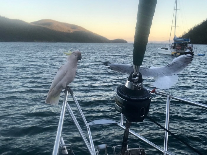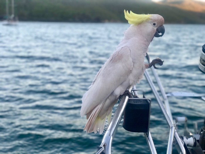 Wieder zurück beim Boot bekamen wir noch Besuch von einem, bei allen Seglern bekannten, fast zahmen Kakadu. Kim fütterte ihm Brot, welches er unheimlich sanft in seien Klauen nahm und dann elegant verspeiste!