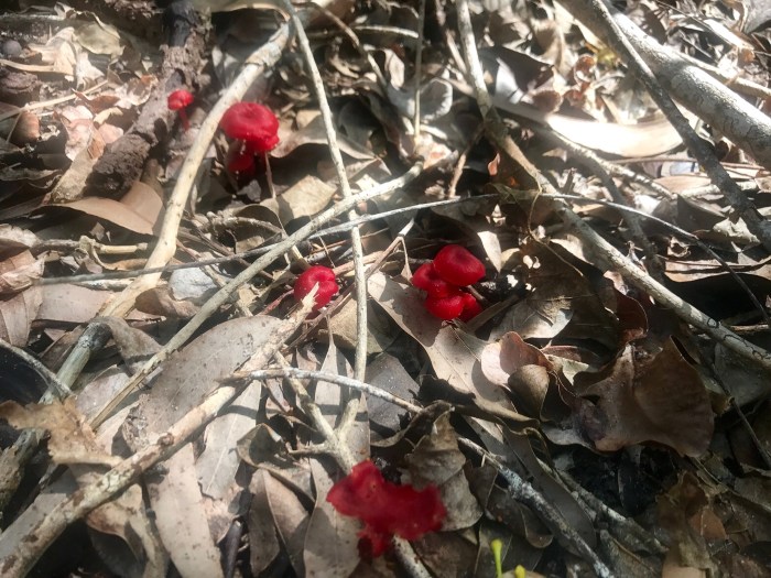 Bei der kleinen Wanderung durch den Bush entdecken wir einen Goana und knallrote Pilze