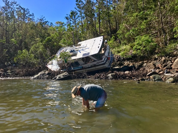 Trauriges Bild. Dieses Boot wurde Opfer der Gewalt des Zyklons Debbie im April 17. Kim findet noch einen der Anker am Grund