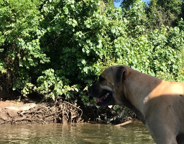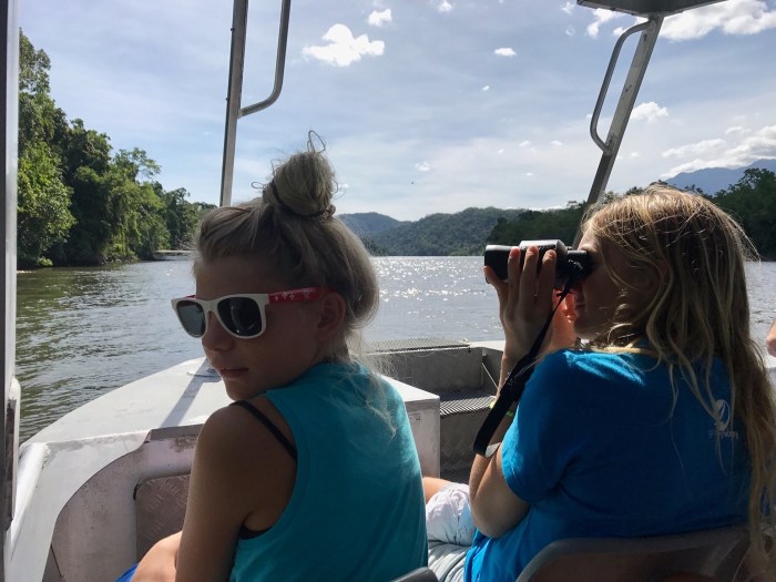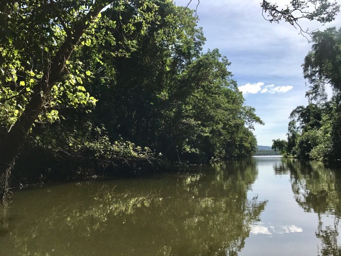 Es war dann auch fantastisch, wie unser Führer das offene Boot ganz nahe ans Ufer und nahe zu dem sonnenden 4m Exemplar, das mit offener Schnauze im Schlamm lag, parkierte, so dass wir das Tier perfekt betrachten konnten! Und es waren noch mehr, denen wir begegneten: Immer wenn das Boot langsam in Richtung Ufer fuhr, wussten wir, da muss eines liegen. Aber es war für unsere ungeübten Augen so gut getarnt, dass wir es meistens erst sehen konnten, wenn wir schon ganz nahe waren! Wir durchfuhren den schmalen Durchgang zwischen der «Pig Island» und dem Hauptfluss, was aufregend abenteuerlich war und bei welchem wir noch einen der knallgrünen Fröschen und ein leuchtend blauer Eisvogel sehen konnten. Am Ende hatten wir fünf oder sechs Krokodile gesehen. Darunter ein Alpha Männchen von 5m!