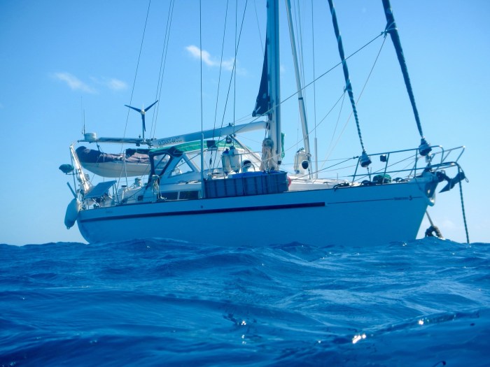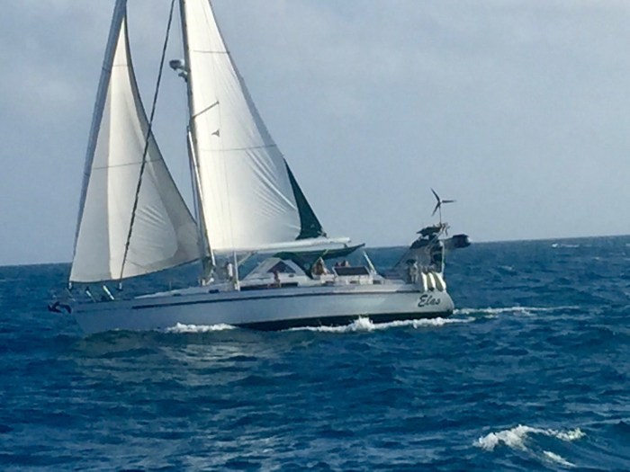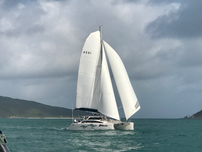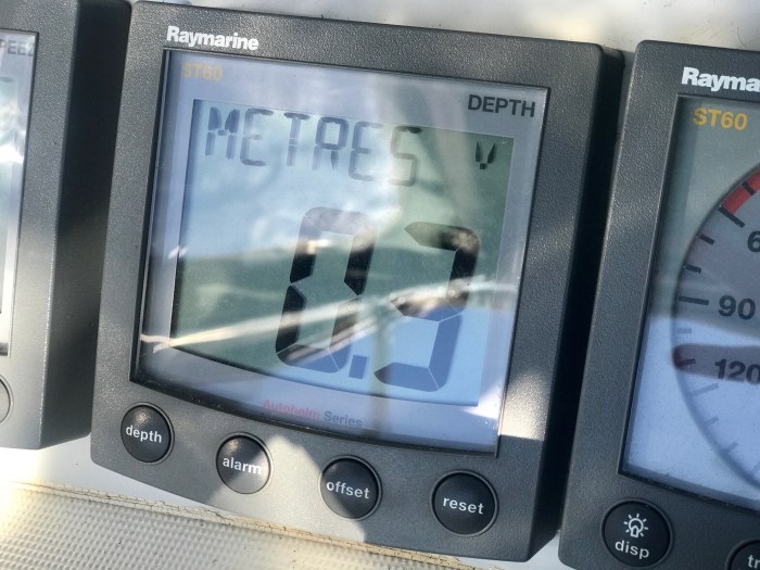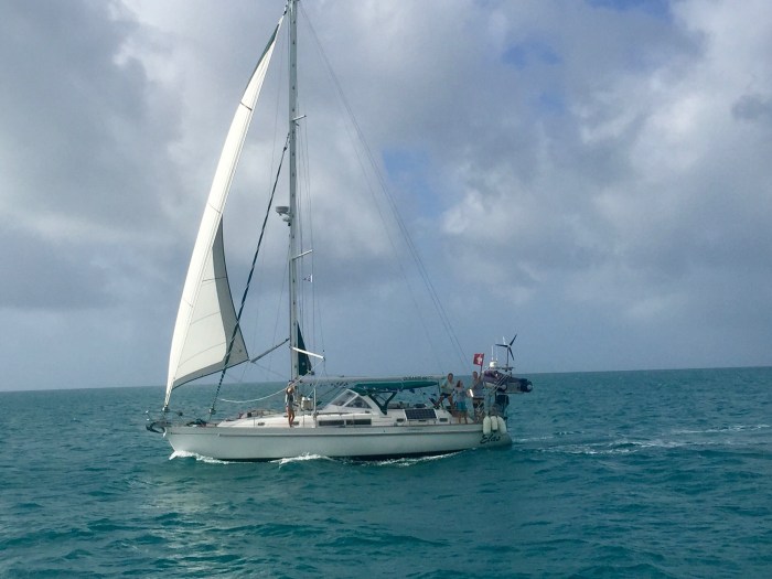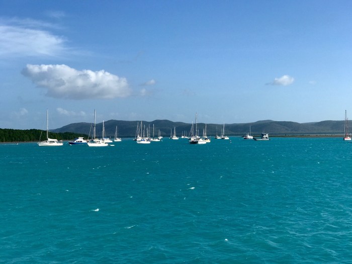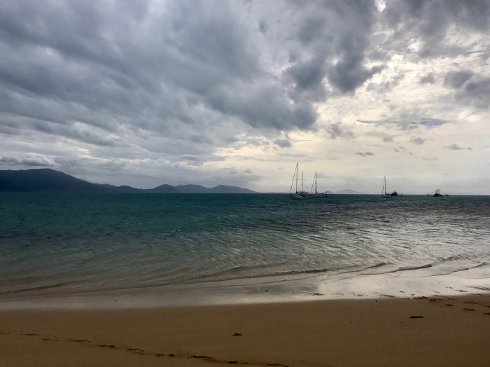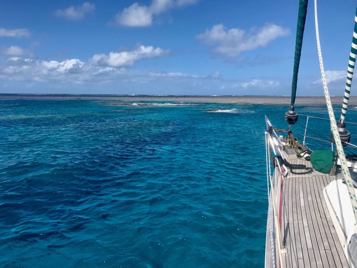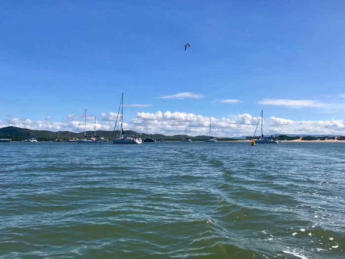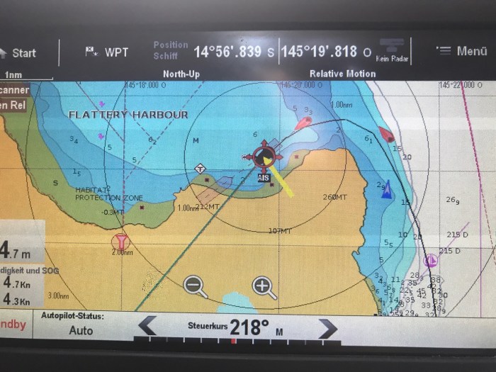 Mit uns auf dem Weg waren zwei weitere Boote: «Billaroo» und «Our Reflections» Bev und Clark. Die beiden Katamarane waren voraus und wir sahen sie gegen Wind und Wellen kämpfen. Wir hatten es uns leichter vorgestellt, da wir ja immer noch hinter dem Barrier Riff waren. Doch der 20 Knoten starke Wind liess eine unschöne Wellenhöhe entstehen! Drehen lag nicht mehr drin, wir mussten die harten fünf Seemeilen erdulden! Was für uns eine ganz neue Erfahrung war, dass wir im Klitsch waren mit unserem Vertrauen zu den elektronischen Karten, mit denen wir navigieren, und unseren Augen. Unsere Mit-Segler fuhren vor uns auf direktem Weg über auf unseren Instrumenten verzeichnete Untiefen! Wir nahmen den sicheren Umweg über grössere Wassertiefen. Gemäss unseren Karten müssten wir über Tiefen von ca 4 Metern gefahren sein, doch unsere Augen konnten keine Farbveränderung des Wassers ausmachen, trotzt klarem Wasser und Sonnenschein. Und unser Tiefenmesser bestätigte unsere Annahme – das Wasser war an den meisten Stellen über Zehn Meter tief! Wie kann es sein, dass so viele geringe Tiefen mal gemessen worden sind und heute ist der Meeresgrund flach und tief? Es war uns ein Rätsel. Weniger Probleme mit solchen Beobachtungen hatten unsere Freunde von Billaroo. Ihre Karten waren ganz unvermessen, sie fuhren über ein blankes Feld auf ihrem Computer!