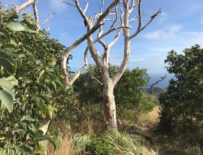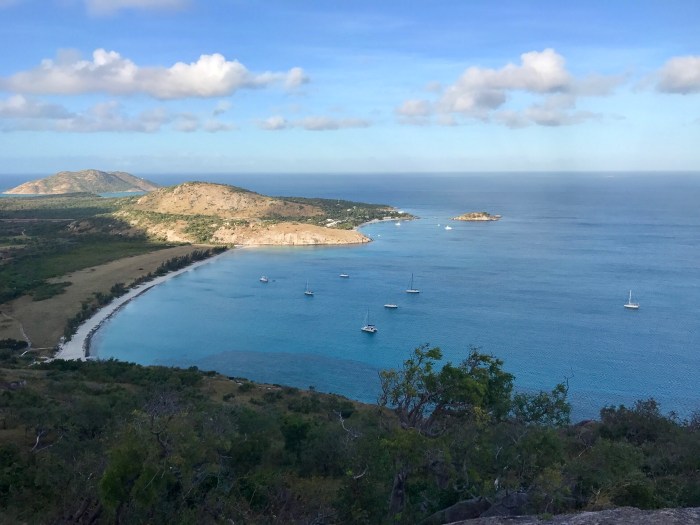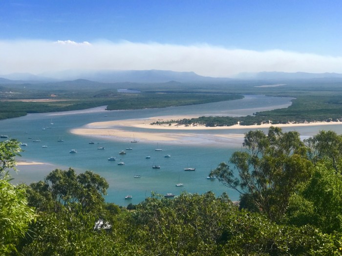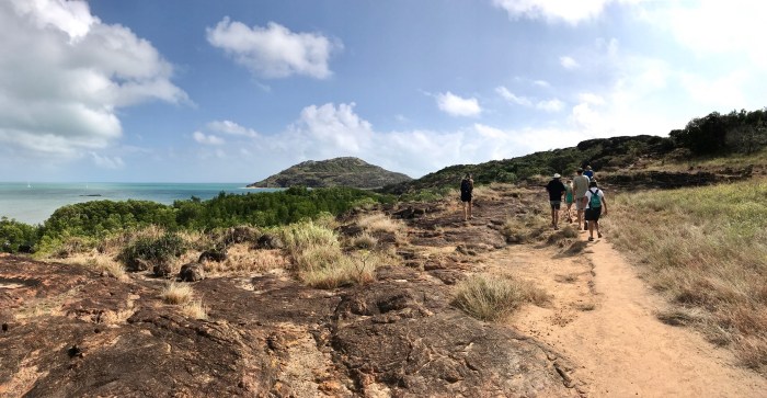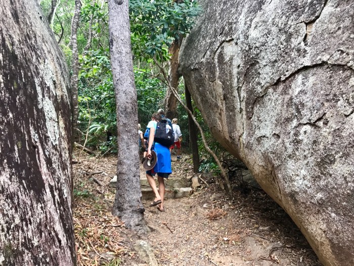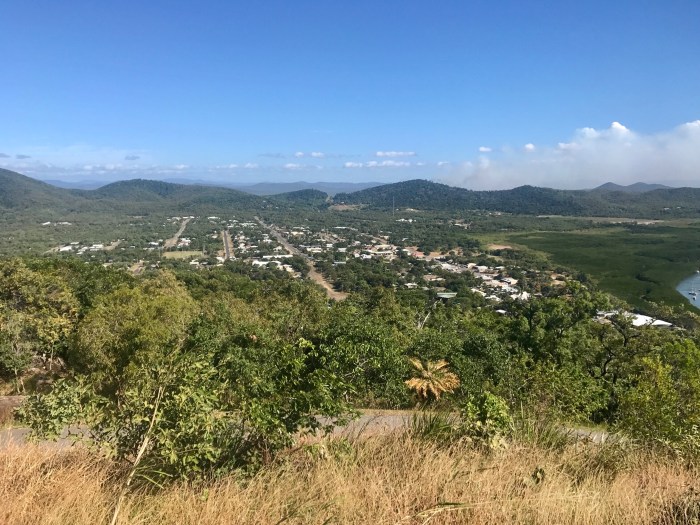 Unterdessen waren einige Boote in der Bucht versammelt, die die «Sail2Indonesia-Rally» mitmachen. Viele davon kennen sich schon und andere wurden sich vorgestellt. So kam es auch, dass eine ganze Gruppe Segler am nächsten Tag frühmorgens loszog, um auf den «Mount Cook» zu steigen! Der Aufstieg zum Mount Cook lag am Ende der langgezogenen Stadt. Wir waren eine ganze Weile auf den breiten Strassen unterwegs, bis wir dann in den Busch eintauchen konnten. Der erste Teil des Aufstieges war ein ganz neu erstellter Wanderweg. Vorbei an grossen Felsplatten hinauf bis zum ersten Aussichtspunkt! Wieder blies uns der Wind fast vom Podest, so stark waren die Böen. Diesmal war die Aussicht nicht mehr auf den Endeavour River, sondern östlich aufs Meer hinaus. Aber der Aufstieg ging noch weiter und zwar steiler und faszinierender als zuvor. Schmal ging der Weg durch den dichten Regenwald, vorbei an riesigen Felsbrocken an denen wir mit roten Köpfen und teilweise fast auf allen Vieren vorbei kletterten. Die verschiedensten Pflanzenarten des reichen Regenwaldes sahen wir schlangenartig an Bäumen emporwachsen und andere, farnartige Gewächse wuchsen auf glatten Steinflächen. Es war eine vielfältige und interessante Wanderung den Berg hinauf. Nach einem Sandwich ein wenig weiter unten, begaben wir uns danach wieder hinunter in die Siedlung.
