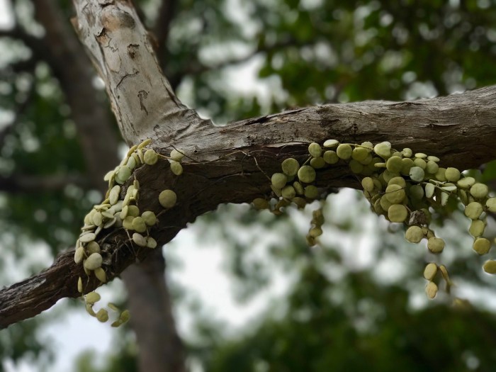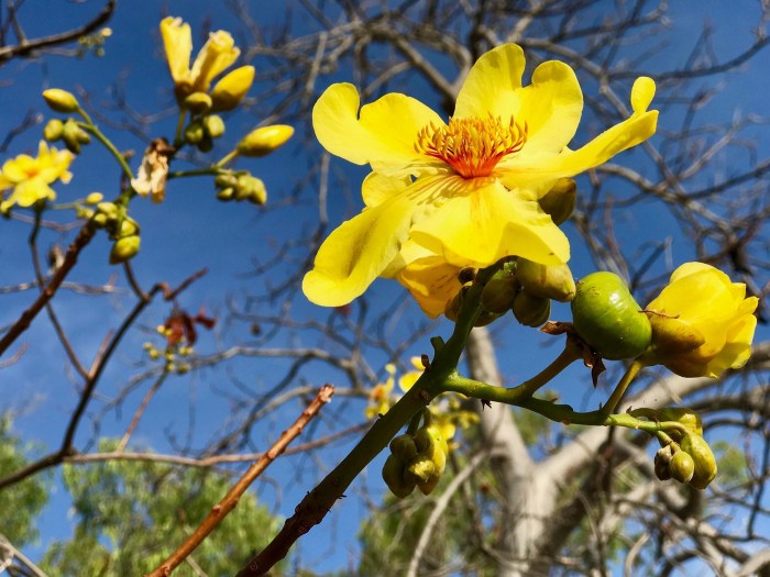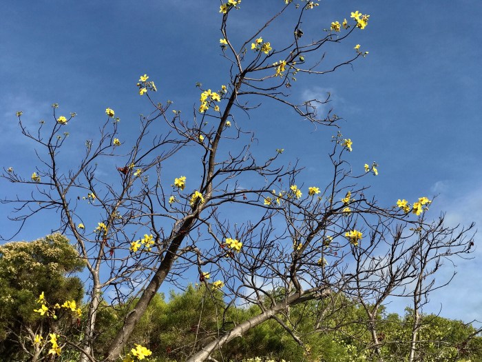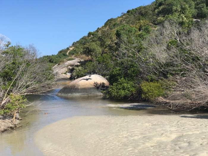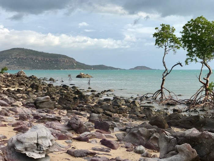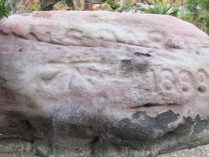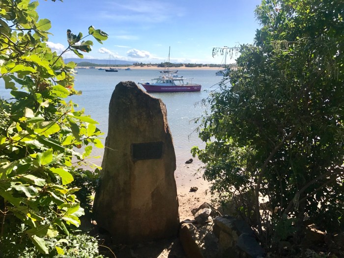 Die «Flinders Group» lag ca 50 sm entfernt. Die Segelbedingungen waren in den letzten Wochen nahezu identisch. Wind um die 15 bis 25 Knoten von Achtern. Meistens Sonnenschein und ein paar Wolkenfelder. Wir legen, gut geschützt hinter dem «Great Barrier Reef», schnell viele Meilen hinter uns! Die Flinders Group ist eine Inselgruppe mit fünf Inseln. Unser Ankerplatz war zwischen den beiden Grössten im «Owen Channel». Mit «Billaroo» zu segeln heisst immer ein Rennen zu fahren und vor allem – immer zu verlieren! Wie könnte es anders sein, bei einem 45Fuss Katamaran kommt die Elas nicht mit! Doch es war reizvoll wie wir dann beide, fast zur gleichen Zeit, in den Kanal hinein segelten – sie von Süden und wir von Norden. Wir wollten an Land. Egal ob auch hier Krokodile ansässig waren oder nicht. Die kleine Exkursion an Land führte uns hinter dem Mangroven Ufer, am Strand entlang. Nackte Bäume, ohne Blätter aber mit knallgelben Blüten zogen uns an. Eine Baumart die wir bisher noch nie gesehen haben. Weiter über Felsen klettern entdeckten wir unerwartet eine Infotafel! Inmitten dieser abgeschiedenen Landschaft erstaunlich! Der Hinweis war geschichtlicher Art. Ende des 18. Jahrhunderts kamen Schiffe her um Frischwasser zu tanken. Ob wir den freigeräumten Weg erkennen könnten, wo sie damals die Fässer zum Boot gerollt hätten? War die Frage! Dem wollten wir natürlich auf die Spur kommen und schauten uns umher. Und tatsächlich, es gab eine Stelle wo frei von Felsbrocken war und weiter oben gab es einen kleinen Flusslauf. Ein grosser Fels trug noch die Inschrift des Schiffes. Es ist immer wieder spannend auf Zeugen der Vergangenheit zu stossen!