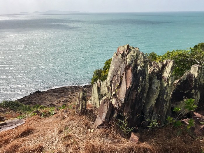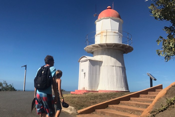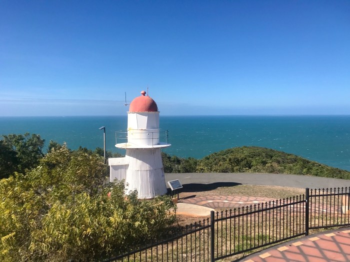 «Grassy Hill» ist der Aussichtspunkt oberhalb Cooktown mit einem alten Leuchtturm, auf den Captain Cook schon 247 Jahren hinaufgestiegen ist um die Umgebung auszukundschaften. Seit unserer Ankunft bläst ein starker Südost Wind und blies da oben heftig über den kahlen Hügel! Die Aussicht auf beide Seiten hinunter bei Sonnenschein war fantastisch. Man konnte die verschiedenfarbigen Tiefen des Endeavour River gut ausmachen und die kleinen Boote darauf. Auf der anderen Seite sah man die verschieden Riffe des Great Barrier Riffs, auf eines von diesen Cook damals mit seinem Segelschiff aufgelaufen und gestrandet war.