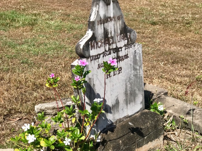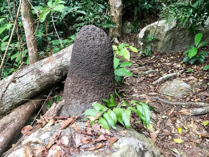 Ein Grab und die Ruinen einer Hütte lassen sich heute noch finden. Die weissen Spitzen sind grosse Termitenhügel