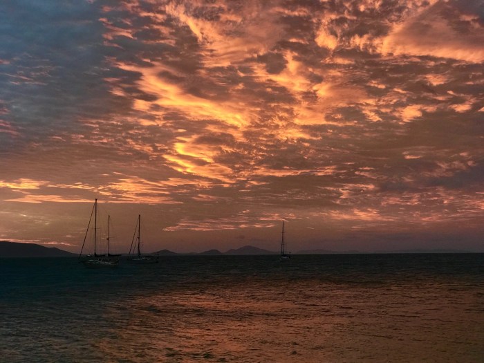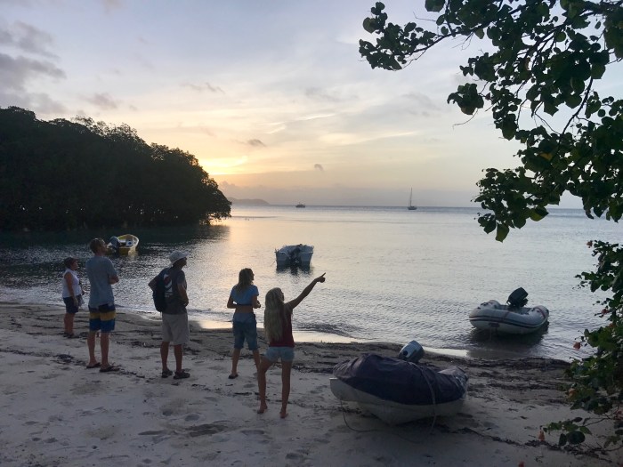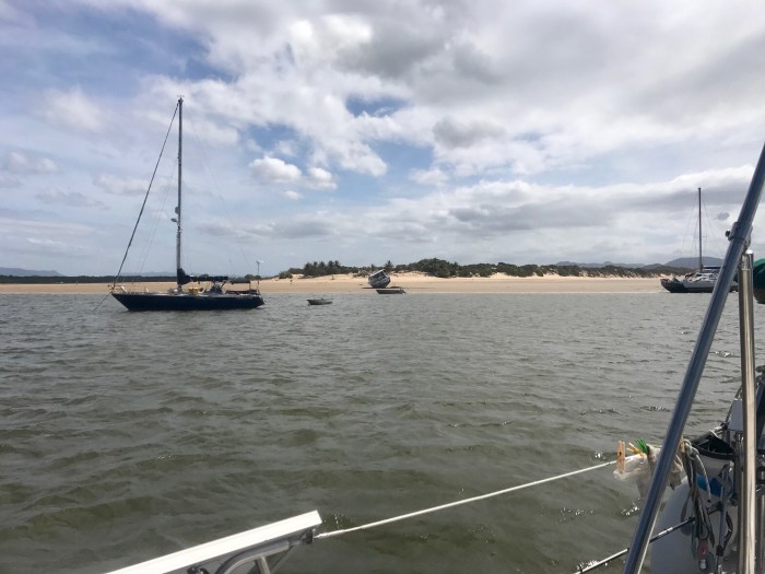 Es ist ein extrem windiger Tag und auch schon ein wenig bewölkt. Es machte uns nicht wirklich an, mit dem Dinghy ans Land zu fahren! Es war klar dass wir bei dem Wind pitschnass werden würden! Aber natürlich wollten wir uns nicht abhalten lassen und fuhren sann sogar zwei mal zum Sandstrand der Insel: Beim ersten Mal trafen wir auf die Bewohner von Zefr1 und verabredeten uns zu einem Sundowner am Abend am Strand! Beim Strand im Schutz der Insel merkte man von den stürmischen Winden nichts mehr und es war so friedlich und still dass auch die Moskitos und die Sandflies unterwegs waren! Wir erzählten uns gegenseitig von unseren schönsten Ankerplätzen und Erlebnissen und tauschten uns über zukünftige aus.