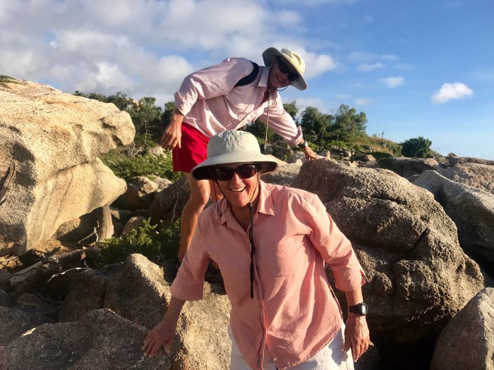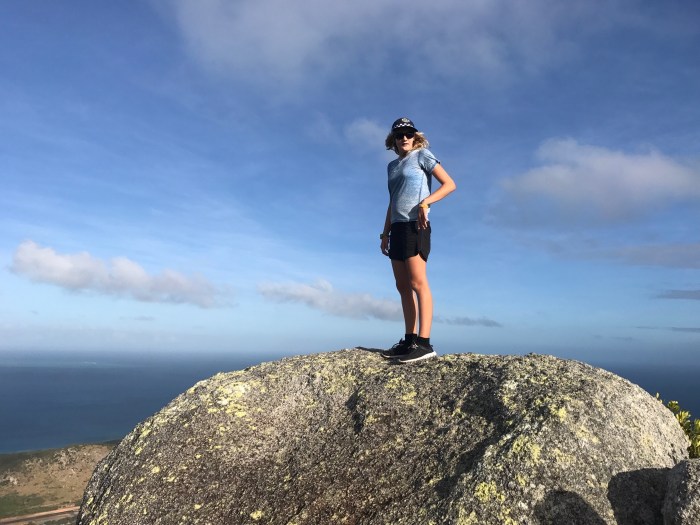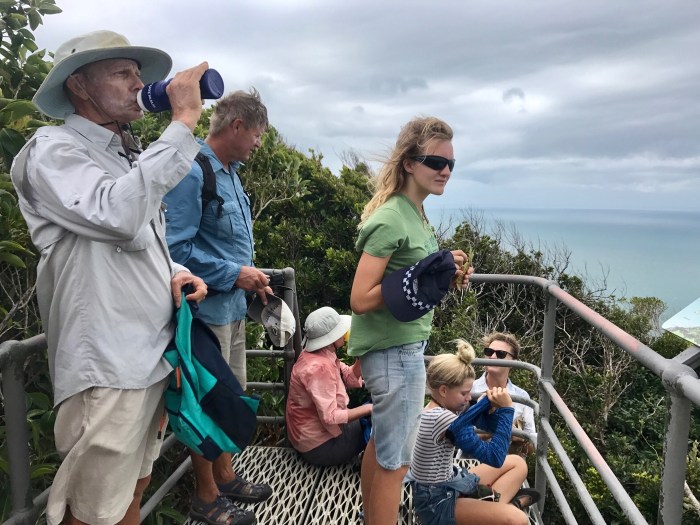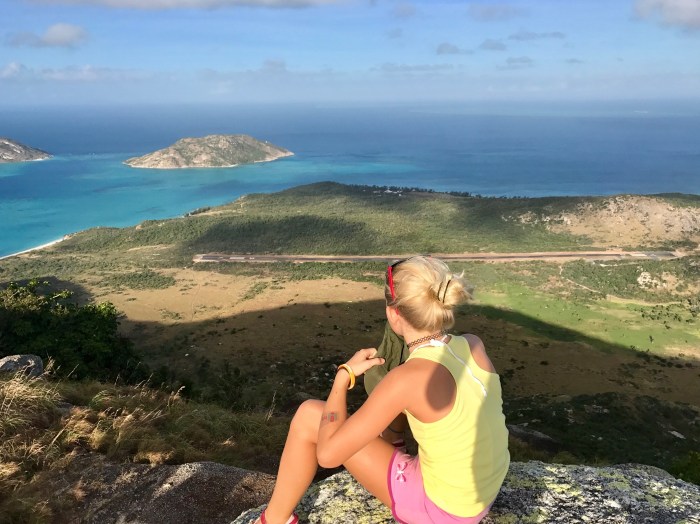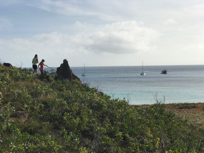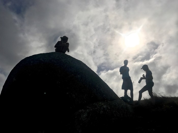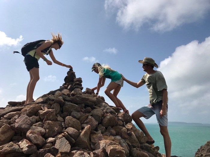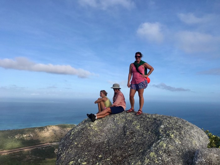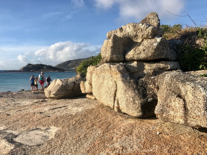 Wir erwischten für unsere Kap Umrundung einen wunderschönen, sonnigen und windigen Tag. Weils so schön war, wollten wir gerade noch einen Hügel erklimmen. Auf der gegenüber liegenden Seite des Kaps war eine Insel auf deren Hügel es scheint, auch schon Menschen geklettert waren. Die Billaroos und die Familie kletterten hoch und ich nahm von ihnen ein Foto, als sie gerade auf dem obersten Gipfel standen!