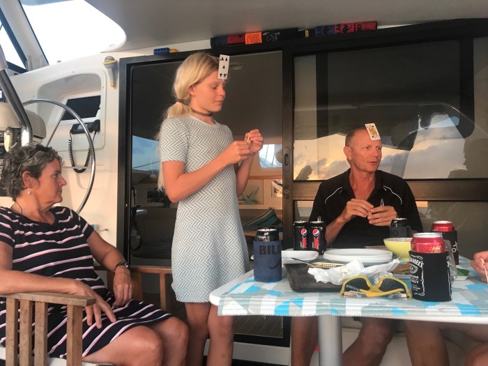 Auf unserem Weg zur Thursday Island waren noch einige Möglichkeiten für Stops. Eine davon war die «Mount Adolphos Island». Die Insel schaute spannend aus und wir waren gespannt. Vielleicht nochmals Baden oder an Land, Auskundschaftungen machen? Doch es gab keine Möglichkeit an Land zu kommen, es war Niedrigwasser und das Riff ragte aus dem Wasser. Zudem gab es viele Mangroven, wir entschieden uns auf dem Boot zu bleiben. Dafür verbrachten wir wieder einen netten (Spiel-) Abend auf der Billaroo bei einem «Pot Luck» (Topf Glück! Jeder bring etwas lecker Gekochtes zum Teilen mit.)