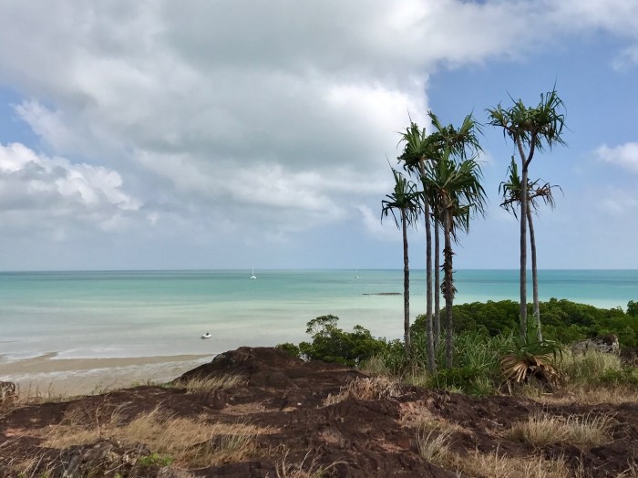 Wir fuhren mit Billaroos Dinghy, in heftiger Strömung, zwischen der einen Insel und dem Festland hindurch, umrundeten sozusagen das Cap York mit dem Dinghy – nicht schlecht oder! Die Leute am Land winkten uns zu. Danach landeten wir natürlich noch das Dinghy und gingen zu Fuss den berühmten Pfad hoch. Die vielen Menschen die uns kreuzten, erstaunten uns. Wo kommen diese alle her? Ein paar Geländefahrzeuge stehen, abenteuerlich dreckig, auf dem Parkplatz mit tiefroter Erde. Kamen sie alle auf diesem Weg? Oder wohl doch per Flieger? Wer weiss.
