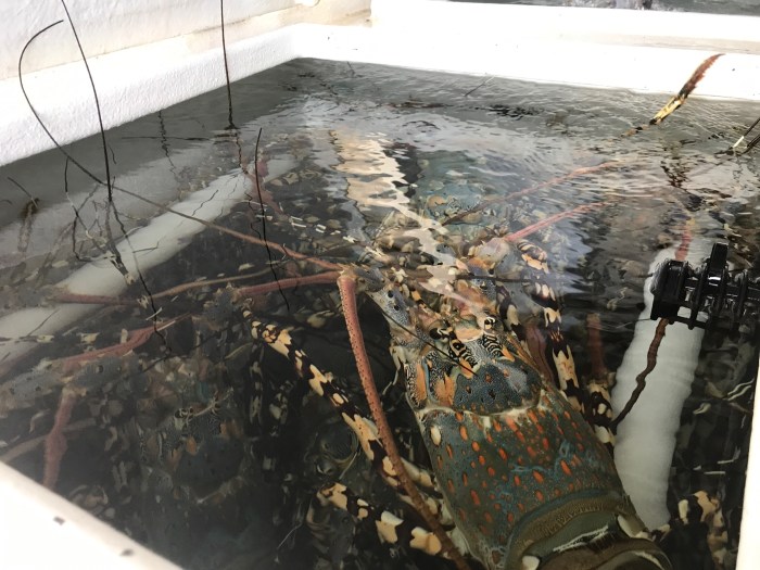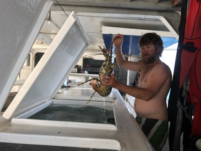 Am nächsten Morgen rückten die Langusten Fischer wieder aus. Sieben kleine Motor-Boote mit Kompressoren an Bord zogen los mit ihren jeweils zwei Männern an Bord: Einem Taucher und einem der oben kontrolliert. Einer blieb an Bord auf dem Mutterschiff. Wir waren noch mit dem Dinghy unterwegs, bevor wir dann an diesem Tag weiter segeln wollten. Wir kletterten noch einmal über den anderen Hügel und schwammen noch im Riff, als wir auf die Idee kamen, kurz bei den Fischern vorbei zu schauen. Der eine Mann der beim Schiff geblieben war, war gerade verletzt und dies war der Grund, dass er nicht mit den anderen Tauchen ging. Er zeigte uns das Boot mit den vielen Wassertanks, wo die Langusten gefangen waren welche lebendig nach China verschifft werden. 22 Tonnen Langusten werden an der Queensland Küste pro Boot gefangen. Vier Boote haben dafür die Lizenz. Ein Kilogramm wird ihnen mit 60 australischen Dollars vergütet – man kann sich vorstellen, zu welchem Preis diese Spezialität dann schlussendlich verkauft wird! Die jungen Männer auf dem Boot waren allesamt gut und witzig drauf und liebten ihren Halbjahres-Job. Sie hatten eine gute Saison und waren nur noch weitere 6 Tage unterwegs. Die Auslieferung erfolgt dann in Cooktown. Und wir waren wieder auf dem Weg nach Norden – nach «Shelbourne Bay».