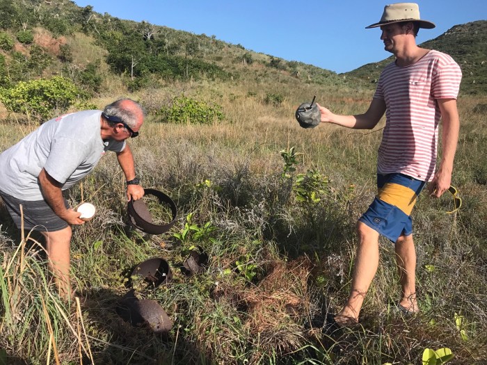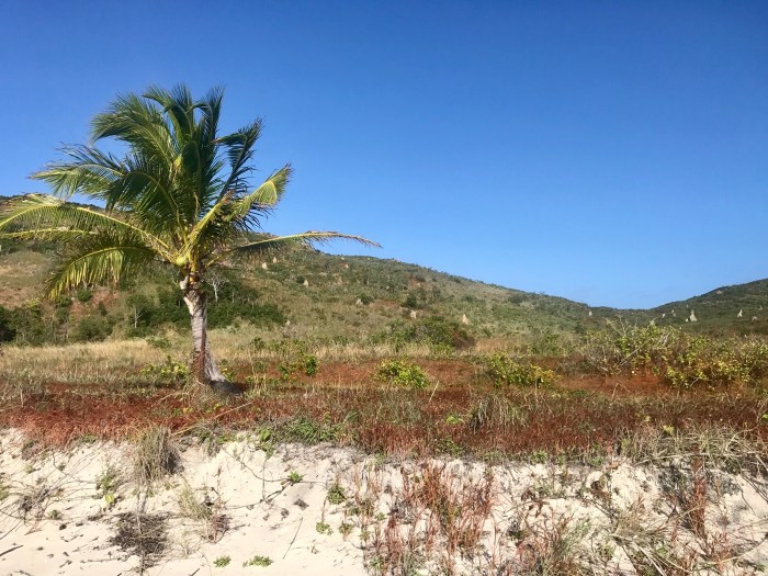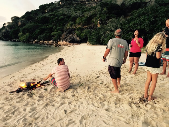 Die Insel schaute prächtig aus! Markant waren die hohen Termitenhügel die rot braun aus dem Grün des Gebüsches stachen! Noch nie zuvor hatten wir so grosse gesehen. Der Sandstrand lag hell vor uns und das Wasser türkisblau! Die ganze Crew brach auf, an Land. Ein Hügel wurde erklommen, geschwommen und wir zogen es in Erwägung, später ein Feuer am Strand zu machen! Es wurde reichlich spät, bis alle wieder bei ihren Booten waren und mit etwas zum Grillen zurück kamen! Aber der Abend war so wunderbar mit dem Feuer und der Stimmung dass von der andern Seite die Idee kam, dieses gerade nochmals am nächsten Abend zu wiederholen! Diesmal aber brieten wir frisch gefangenen Fisch auf dem Feuer! Die zwei Abende am Strand waren superschön. Gute Stimmung und gute Gesellschaft! Schon spät, entdeckten wir die Lichter eines herannahenden Bootes. Bald darauf kam auch schon ein Beiboot zu uns an Land. Wir waren ein klein wenig beunruhigt, da es eigentlich untersagt ist, Feuer zu machen. Doch die Leute die sich zu uns gesellten waren «Crayfish» Fischer, also Langusten Fischer! Sie kamen oft bei der Insel vor Anker und selten, ganz selten finden sie andere Leute da. Sie waren erfreut das Feuer zu sehen und Bekanntschaft zu machen und wir ebenso! Viel Interessantes bekamen wir zu hören!
