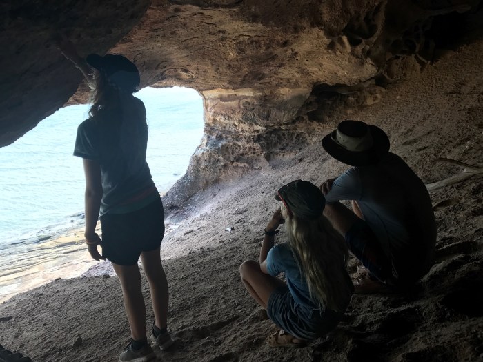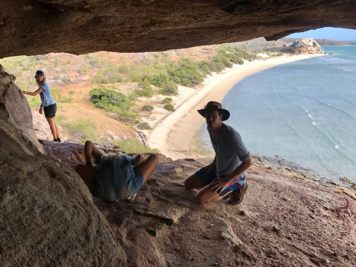 Es war einfach zu schön und zu interessant um am nächsten Tag weiter zu fahren. Zudem haben wir gelesen dass es auf der einen Insel Aborigines Höhlenmalereien zu sehen gab. Glücklicherweise waren auch Sue und Kerry dabei, auf die Suche nach diesen zu gehen! Uns sie haben ein viel schnelleres Beiboot als wir und so düsen wir am nächsten Tag 15Minuten übers Wasser und Wellen um ans Ende des Kanals zu gelangen. Wir hatten keine Ahnung ob wir am richtigen Ort gelandet waren, aber es war fast der einzige Ort wo wir mit dem Dinghy anlanden konnten. Nach ein paar Metern Fussmarsch wussten wir dass wir richtig sind! Wieder eine Infotafel mit Wegbeschreibung. Was danach kam war einfach einzigartig. Zuerst erklommen wir Höhlen die nicht beschrieben worden sind, aber es war einfach zu interessant die Felsen hinaufzuklettern und den Blick über den Strand und das Meer schweifen zu lassen. Dem weiteren Pfad folgend kamen wir dann zu den eigentlichen Höhlen, welche aber eigentlich nur ein sehr grosser und ausgesprochen langer Felsvorsprung war. Die Malereien waren überwältigend schön! Und überall sahen wir alte, ausgebleichte Muschelreste am Boden liegen. Zeugen der früheren Lebensstätten der Aborigines, welche bis Mitte 19. Jh auf den Inseln gelebt hatten. Ein ganz eindrücklicher Ort!