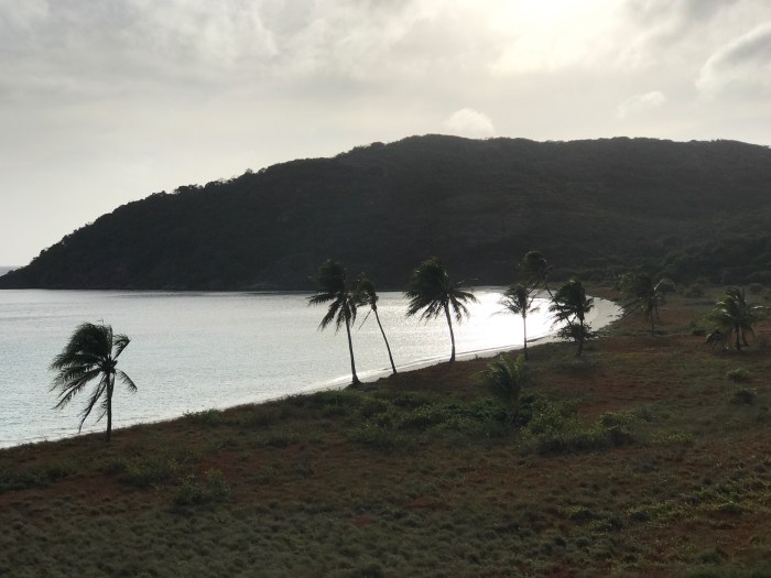 Weitere 50sm entfernt war unser nächster Ort wo wir einen geschützten Ankerplatz in dieser abgelegen Gegend fanden, die «Morris Island», eine winzig kleine, flache Sandinsel hinter einem Riff. Der Himmel war von dunklen Wolken durchzogen und wir hatten an diesem Tag auch mehr Wind! Gegen späteren Nachmittag kamen wir bei der Insel an. Es reichte gerade noch um einen kleinen Rundgang zu machen! Die Insel war von vielen Yuka Palmen bewachsen und von hunderten von Vögeln bewohnt! Spuren im Sand führten zum Wasser. Grosse Leguane oder vielleicht doch Krokodile? Aber riesig waren die Spuren nicht, wir waren nicht allzu beunruhigt!