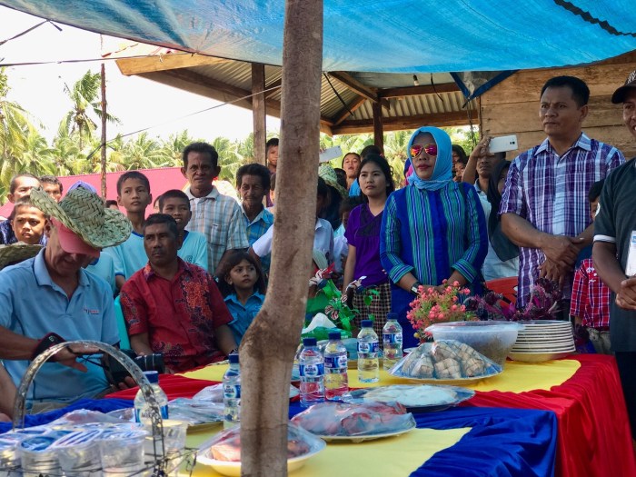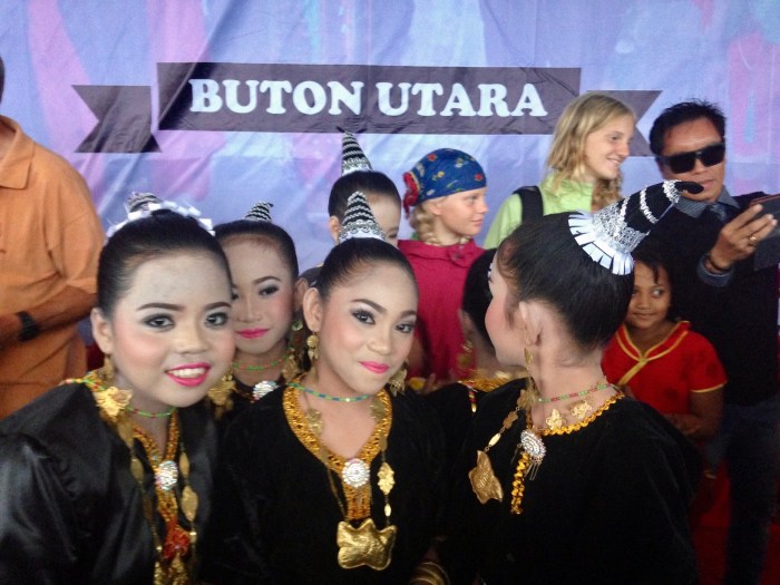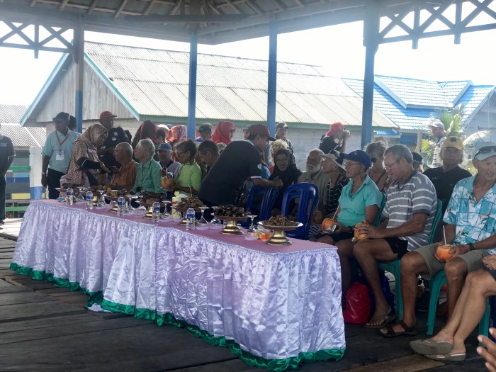 Wir waren hier wiederum die ersten Touristen, die das Dorf zu sehen bekam! Wir kamen uns wieder ein wenig vorgeführt vor, wie die Affen im Zoo. Aber dies war vor allem bei den öffentlichen Anlässen, wie zum Beispiel beim «Gala Dinner», wo die halbe Stadt hinter den Abschrankungen uns zuschauten, wie wir uns an dem reichen Buffet bedienten… Und zu unserer Begrüssung ein Festzelt aufgebaut wurde mit grossen Plakaten und Dekorationen und seidenen Stuhlbezügen! Wir wurden vom Regent der Region Nord Buton zum Tee eingeladen. Unser Erscheinen in der Region war ein Politikum! Wie hohe Staatsbesucher wurden wir willkommen geheissen – was für uns «Gotty Yachties» recht aussergewöhnlich war. Doch wir machten unser Bestes daraus, uns angemessen zu verhalten und unsere Heimatländer anständig zu vertreten, ein gutes Bild abzugeben!