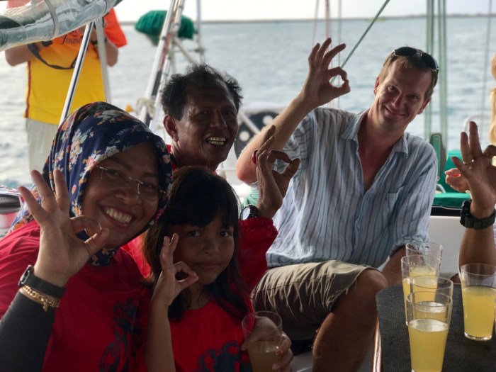 Unsere Reise nach Südwesten, nach «Nord Buton», einer Insel die sich an die grosse und bekannte Insel «Sulawesi» anschmiegt, verlief entspannt und friedlich. Wir hatten Vollmond und sehr warme Nächte. Unsere Planung hatte sich auch bewährt, wir legten am Abend nach der letzten Feier nachts um 23Uhr noch ab. Wir brauchten auf diese Weise zwei Nächte und einen Tag und erreichten unser nächstes Ziel am Morgen des folgenden Tages, perfekt bei Tageslicht. Dass nicht alle Planungen so selbstverständlich erfolgreich sind, konnten wir am Abend beim Sundowner auf der Billaroo feststellen: Ein Boot kam bei Dunkelheit an, hatte nicht die Navigationshilfen wie wir mit den Satellitenbilder und fuhr unglücklicherweise auf ein Riff. Beim nächsten Hochwasser schwamm es aber bereits wieder, ohne weitere Schäden.