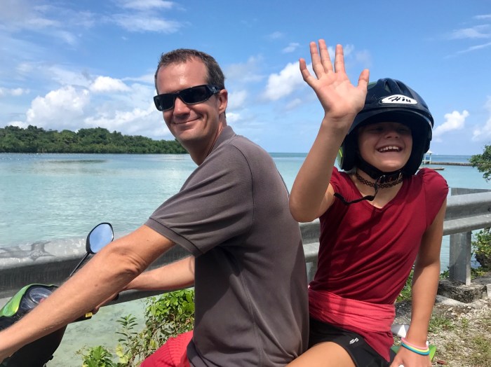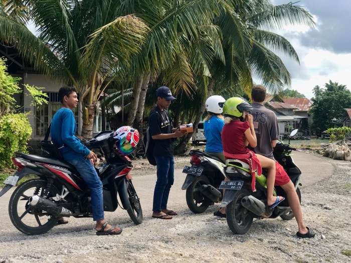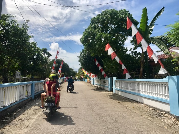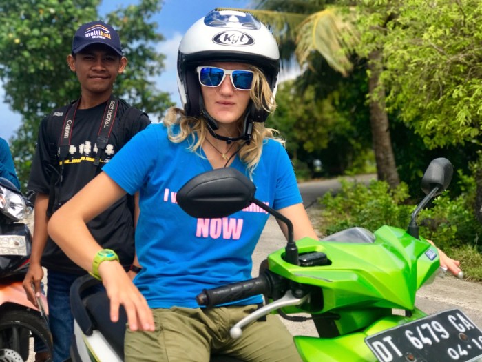 Ein zwei Mal waren wir in Wanci unterwegs. Jedes mal kamen junge Menschen aus Wanci mit uns, die uns zeigten wo wir was finden können und sich mit uns unterhielten. Englisch sprechen zu können ist ein Tor zur Welt und die jungen Leute waren sehr interessiert, möglichst viel in Erfahrung bringen zu können und fragten uns Löcher in den Bauch! Drei Namen dieser liebenswerten jungen Menschen waren «Ecca», «Aldy» und «Rivan». Alle drei zwischen 16 und 17 Jahre alt. Wir haben sie ins Herz geschlossen! Was uns also noch fehlte war, die Insel zu erkunden. Obwohl wir uns am Abend zuvor von Rivan und Aldy und Ecca verabschiedet hatten, trafen wir sie wieder beim Steg und beidseitig freuten wir uns, uns unerwartet nochmals zu sehen. Wir hatten vor, zwei Motorbikes zu mieten und die Insel damit zu umrunden. Kim hatte sich erhofft, die Tour auf eigene Faust zu unternehmen, doch Rivan und Aldy waren schon bereit mit ihrem Motorbike und bereit ihre Dienste als Reiseführer anzubieten! Das ist Indonesien – die Menschen sind so interessiert und hilfsbereit, man wird mit offenem Herzen wahrgenommen!