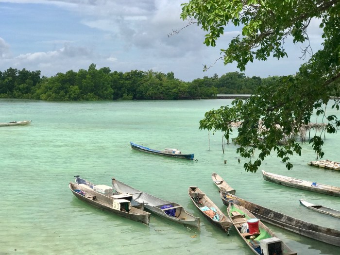 Einige der Ralllyboote haben schon vor uns diese bekannte Destination angelaufen, während wir noch in Buru oder Buton Island waren, so haben wir auch schon viel über die Ankerplätze gehört. Viele segelten auch direkt zur zweiten Insel des Marineparks, nach Kaledupa wo es ein schöner Ankerplatz zwischen Hoga Island und Kaledupa gibt und das Schnorcheln besonders gut sein soll. Zuerst wollten wir aber nach Wangi Wangi, zur nördlichsten Insel mit der grössten Siedlung, die Wanci heisst. Der Trip war nur 40 Meilen, doch leider mussten wir die ganze Strecke unter Motor hinter uns bringen. Der Wind drehte sich mit uns in der Richtung die wir wollten immer auf die Nase! Trotzdem waren wir dank der Strömung recht schnell an unserem Ziel. Wir fuhren in Begleitung von «Surfari». Ken war immer noch sehr geschwächt und so musste seine unerfahrene Partnerin die Strecke selbständig fahren. Mit ein Grund weshalb wir nicht aufkreuzten. Wir wurden vor dem vorgelagerten Riff vom Hafenmeister «Mister Gino» abgefangen. Diese charakteristische Person hüpfte aus dem Gummiboot direkt auf unser Schiff und da Kim gerade unten war, übernahm er kurzerhand das Steuer, puschte den Gashebel und fuhr das Boot – unser Boot! Es gab einen Kanal in die Lagune von Wanci, welche vor 4 Jahren tiefer und breiter gemacht worden war, unsere Satellitenbilder waren nicht mehr akkurat und so auch die elektronischen Karten. Und trotzdem war es ziemlich übergriffig von «Mr. Gino», unser Boot in die Lagune zu fahren, aber wie es manchmal so ist, waren wir zu perplex um zu intervenieren! Ein Glück dass er nicht noch unser Boot ankern wollte, wie er dies bei anderen Booten versucht hatte. Wir waren dann froh als er wieder von Bord ging, mitsamt den Kopien der benötigten Papiere. «Mr. Gino» liebt seinen Job als Hafen-MEISTER!
