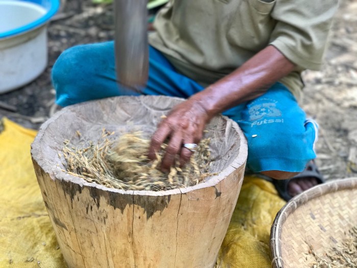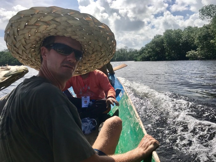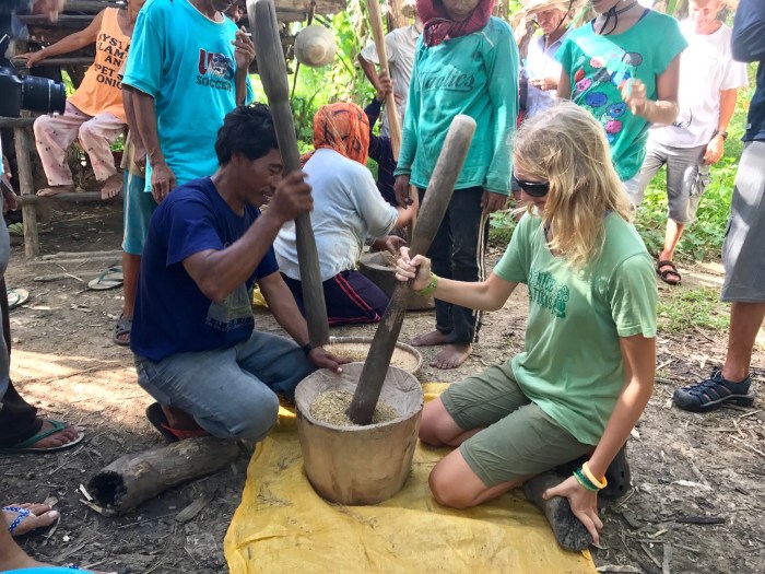 Später stand dann noch der Besuch der «Reisplantage» auf dem Programm. Ich schreibe «Reisplantage» in Klammern, da wir darunter etwas anderes erwarteten! Dazu durften wir wieder in den wackeligen, schmalen Fischerbooten fahren. Diesmal durch den Kanal, durch die Mangroven. Das war natürlich wunderschön und entspannend! Die «Reisplantage» war dann etwa einen zwanzigminütigen Marsch durch den Regenwald entfernt, wobei wir vorbei an ein paar wenigen Hütten kamen, wo ein paar Menschen Reis in Holzschalen mit runden Pfählen auf traditionelle Weise vom Spreu trennten. Es war spannend zuzuschauen, wir drei Personen im selben Rhythmus ihre Holzpfähle in die Schalen sausen liessen. Doch beim eigenen Ausprobieren stellten wir fest, wie schweisstreibend und hart dies ist! Ein paar Schritte weiter war dann die «Plantage». Doch von Reis war weit und breit nichts zu sehen, nur durch Steinmäuerchen abgetrennte, trockene Felder mit Bohnensprösslingen. Die Reispflanzen lagen als getrocknetes Stroh am Boden, die Reissaison muss wohl vorüber sein. Zudem stellten wir uns die «Plantage» auch viel grösser vor… Doch, als wir den Menschen die uns auf unserem Boot besuchten, den von dort gekauften Reis zeigten, kam ein Strahlen über alle Gesichter; es muss wohl doch ein bekanntes, lokales Produkt sein!