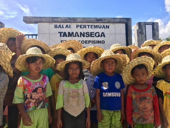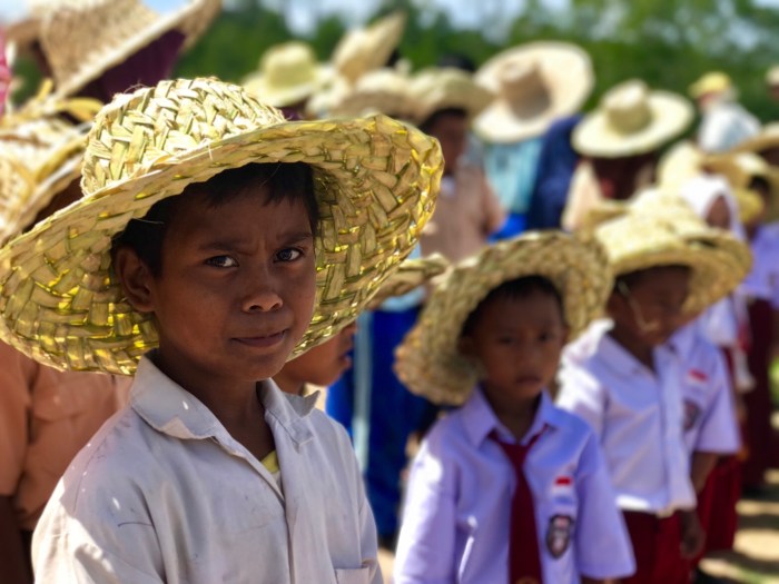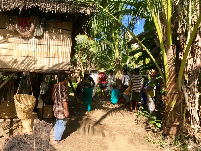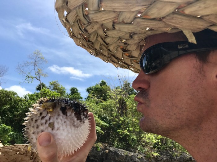 Bei dem Dorf angekommen, wurden wir alle mit aus Palmenblättern geflochtenen Hüten begrüsst und von einer Schar Kindern und Dorfbewohnern ins Dorf geführt. Im Zentrum war wiederum ein grosser Tisch mit lokalen Speisen darunter für uns vorbereitet. Diesmal gab es sogar Mudcrabs und Muscheln. Alles war in geflochtenen Palmblätter Körben aufgetischt! Der auf der Insel angebaute Reis durfte nicht fehlen. Es wurde uns mit all den Speisen gezeigt, was die Bevölkerung der Insel auf dem Speiseplan hatte. Dazu gehört auch der Mangroven Wurm! Dieser war aber zur Erleichterung vieler nicht aufgetischt worden, doch einer der älteren Einheimischen zeigte uns die «Delikatesse» und gab uns zu probieren! Wer ist wohl so tapfer und isst wacker ein Stück von dem weisslichen Wurm?!