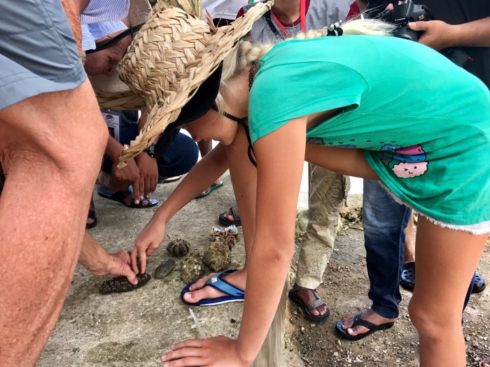 Es wurde uns viel gezeigt. Am ersten Tag wurden wir mit Bussen an diverse Plätze der Insel chauffiert. Zu einem Fort, zu einem Süsswassersee im Kalkstein wo wir baden konnten, zu einem tiefen Tunnel, der von Hand gegraben worden ist um zu Trinkwasser zu kommen und der immer noch von der Dorfbewohner benutzt wird und zu einer Schildkröten Schutzstation. Dabei fuhren wir an Dörfern vorbei, Dörfern die nur aus Holzhütten bestanden und vorbei an Dörfern mit chicen Steinhäusern. Es gab viel zu sehen!