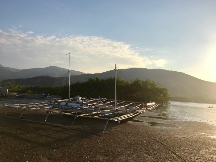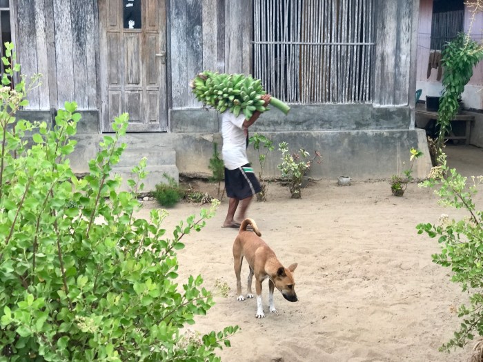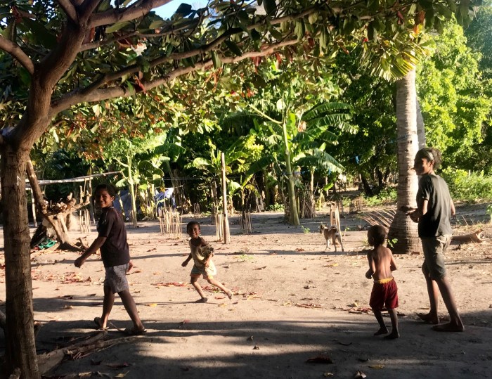 Wir blieben drei Tage an diesem Ankerplatz. Jeden Abend genossen wir den fantastischen Sonnenuntergang und das Ritual der zurückkehrenden Fischerboote. Wir machten auch Bekanntschaft mit den Menschen an Land. Wir wurden nicht ganz schlau, wieviele Familien genau auf dem kleinen Landstrich wohnten, vielleicht 3-4 Familien. Die Kinder kamen mit ihren Kanus zum Schiff und brachten saftige Früche, was wir für eine schöne Geste hielten. In den drei Tagen wurden wir dann auch einiges an Dingen los: Kleider, Schuhe, Hüte und Schätze wie Taucherbrillen, Schnorchel und einen Kinder Tauchanzug. Es war ein guter Ort, um Dinge zu verschenken. Die Menschen besassen nicht viel, doch waren sie zufrieden. Als wir bei der Hütte waren, strichen allerlei Tier umher; Hühner, junge Hunde, Katzen und Schweine. Einen Garten konnten wir nicht ausmachen, doch der Brunnenschacht war gleich neben dem Haus und erstaunlicherweise dieses recht nahe dem Strand. Eine Strasse zum nächst gelegenen Ort konnten wir nicht ausmachen, so waren die Familien wohl aufs Boot angewiesen.