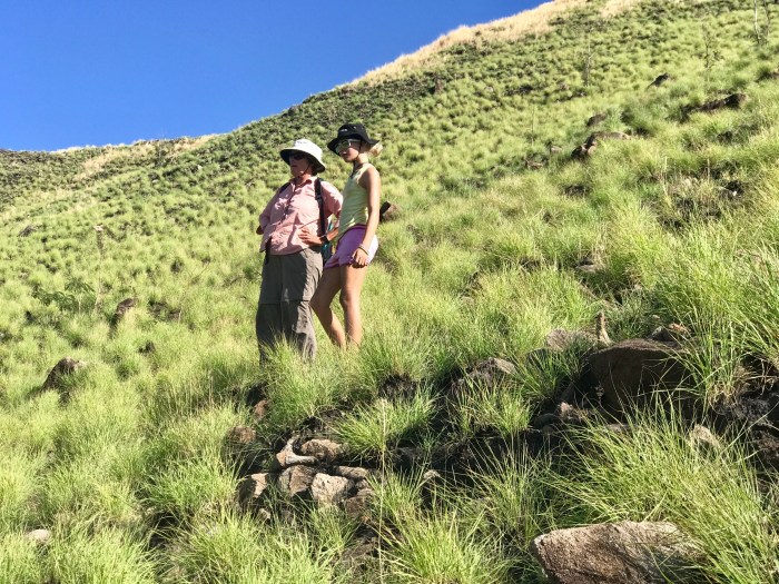 Die goldgelbe Hügellandschaft um uns herum war äusserst einladend, zu erklimmen, und nach sechsunddreissig Stunden sitzen, eine gute Möglichkeit sich zu bewegen. Also verabredeten wir uns für die frühe Morgenstunde mit den «Billaroos» und den «Muscats». Trampelpfade gab es keine, wir suchten uns unsere Wege und stellten mit erstaunen fest, dass all das Goldgelbe trockenes Gras ist, das aber grossflächig an andern Stellen abgebrannt worden ist und wo nun frisches Grün wächst. Doch warum es abgebrannt wird und für welche Tiere das frische Grün ist, konnten wir nicht herausfinden. Wir stiegen bis auf den Gipfel und genossen den gigantischem Ausblick, wanderten weiter über die Krete und blickten auf der anderen Seite in die Bucht, wo wir später ankern wollten. Diese Landschaft ging mir direkt ins Herz!