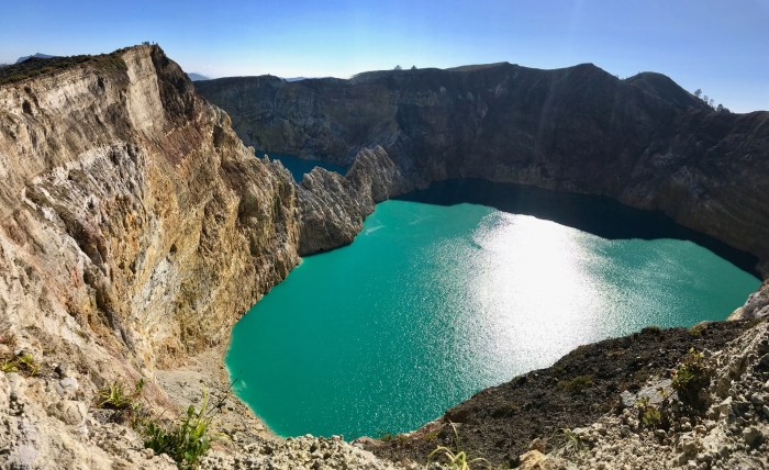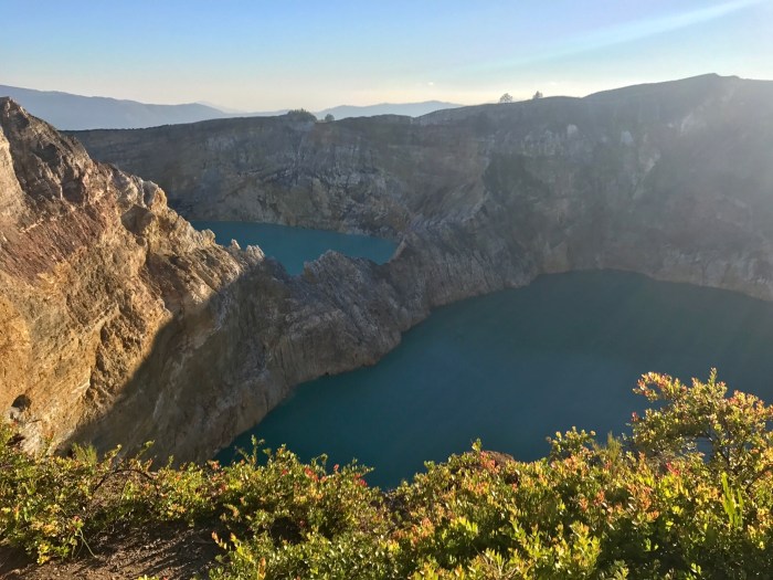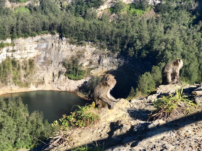 Die Seen lagen dann natürlich im Gegenlicht und von Farbe war noch nicht viel auszumachen. War es eine gute Idee, so früh aufzustehen? Aber die Umgebung war einfach spektakulär. Zwei der kreisrunden Seen lagen dicht nebeneinander und nur durch eine schmale Felsmauer getrennt. Diese beiden unterscheiden sich bei einer gewissen chemischen Zusammensetzung des Wassers in der Farbe. Der eine erscheint dann rot und der andere Grün. Dies passiert von Zeit zu Zeit wenn sich im Innern des Vulkans etwas tut. Der dritte See, der ein wenig weiter ab liegt, ist dunkel beziehungsweise sagen die Einheimischen, «schwarz» So wie wir die Seen zu Gesicht bekamen, war der eine eher dunkelgrün und der andere leuchtend türkisgrün und der «Schwarze» war braungrün. Die Farben zeigten sich dann mehr und mehr bei zunehmendem Sonnenlicht. Die Sonne stieg und stieg, während wir die gefühlten tausend Treppenstufen zum Ausguck kletterten. Von da oben sah man alle drei Seen. Der Dunkle lag dann direkt unter uns. Dort oben sassen dann auch die kleinen Affen, welche gerne mal den Leuten die frisch gekauften Snacks klauten!