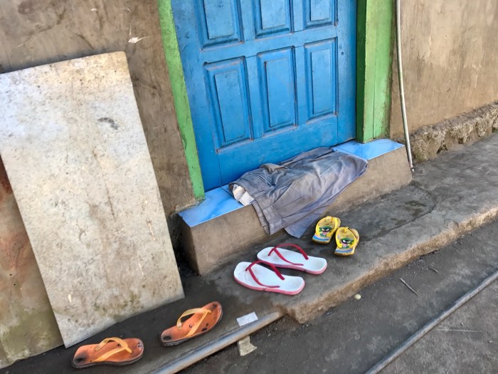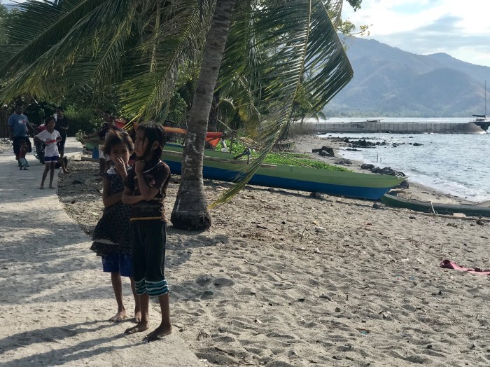 Uns gefiel dieser Ort. Wir lernten Viktor und seine Tochter kennen, die unsere Führer waren und im Ort lebten. Der Ankerplatz war nicht ganz so geschützt aber wir erwischten eine ruhige Zeit. Das Wasser war klar und wir konnten wieder seicht ankern, was toll ist weil man vom Boot aus schnorcheln kann. Die Hütten am Strand sahen ärmlich aus, aber es gab im Ort alle Arten von Häusern, auch schicke Neubauten. Das Dorf war nicht klein aber einen Supermarkt findet man nicht. Die Leute versorgen sich mit dem was sie brauchen in kleinen «Kiosken», Mini Läden die gerade mal Shampoo und Seife, Getränke und Eier haben. Viel findet man da nicht, nie haben wir Mehl oder so entdeckt. Typisch sind die zig kleinen in allen Farben bedruckte Beutelchen, die aneinander gereiht von der Decke hängen. Was da alles drin ist, ist uns noch nicht ganz klar, jedoch verschiedenstes. Vom löslichen Kaffee bis zu Gewürz. Doch unterscheiden sich diese Mini Läden, teilweise sind es dann auch kleine «Baumärkte», wo man zum Beispiel Nägel und Seil erstehen kann. Alles in allem gab es an den Orten wo wir vorbeikamen, nicht viel zu kaufen – im Gegensatz zu unserer Welt. Je mehr man kaufen kann – umso mehr «braucht» man? Der grosse Markt ist dann am Wochenende, wo die Menschen frisches Gemüse, Kleider ect kaufen können.