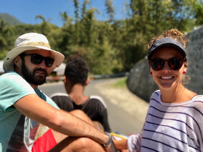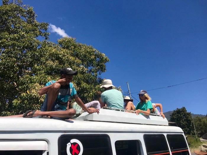 Unterdessen war es heiss geworden und unser überfüllter Bus zu eng für uns alle. Somit flohen ein paar von uns aufs Busdach, von wo aus wir die Umgebung noch viel mehr geniessen konnten! Die hellgrünen Reisfelder zogen an uns vorbei und es war eine Pracht, diese anzusehen. Der warme Wind blies uns um die Ohren – einfach wunderbar!
