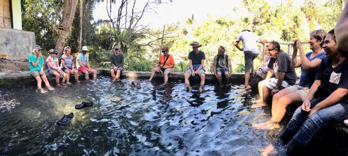 Einen Stop machten wir dann auch noch bei einer warmen Quelle, wo wir alle unsere Füsse im warmen Wasser badeten. Obwohl es so heiss war, war das trotzdem sehr angenehm! Die Quelle gilt als heilsam und die Menschen waschen hier ihre Wäsche mit dem warmem Wasser.