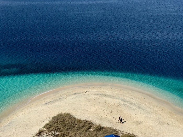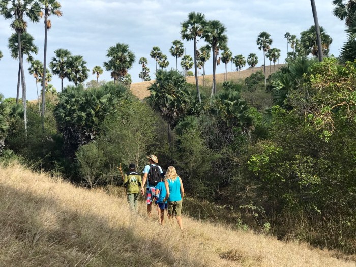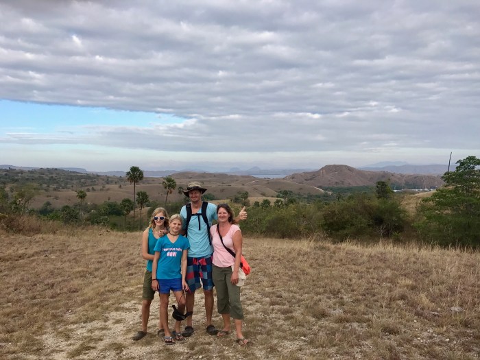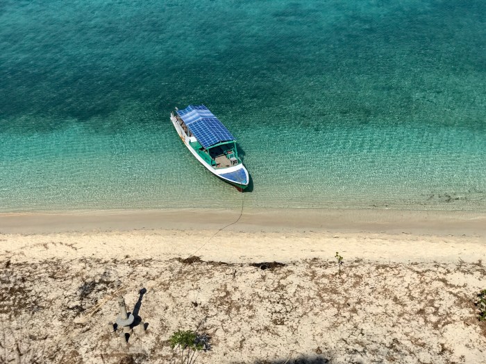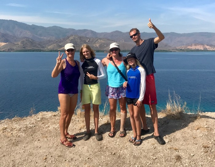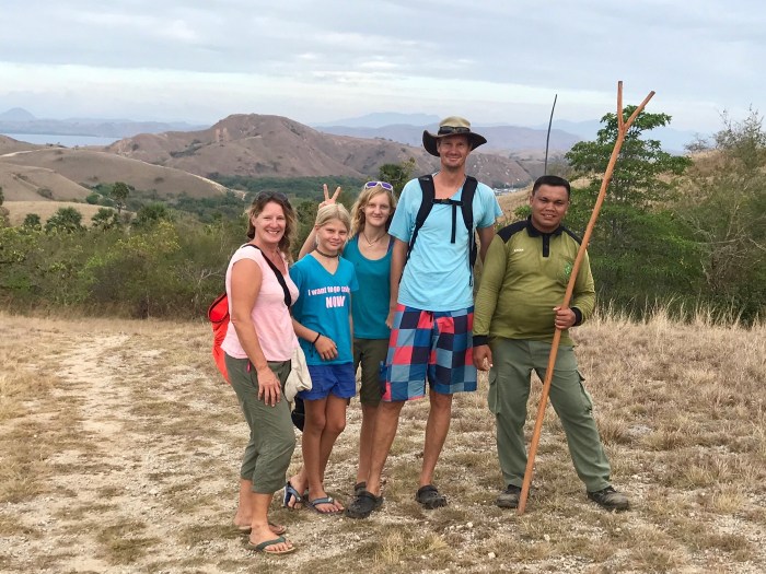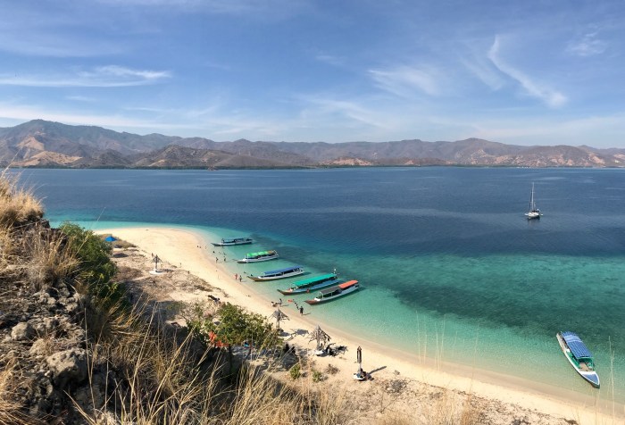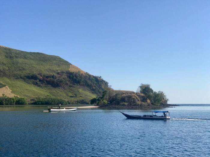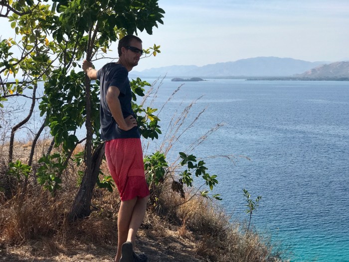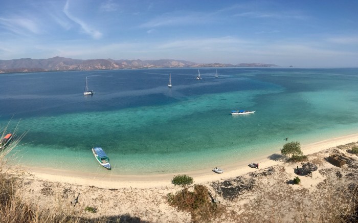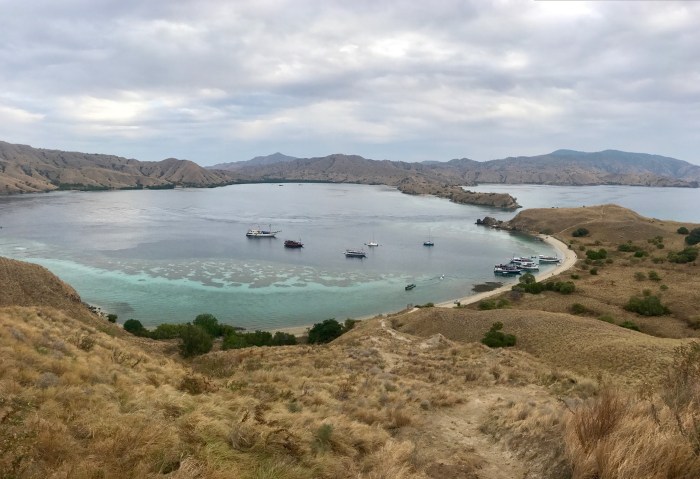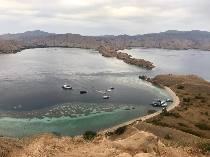Frühmorgens die Komodo Warane, dann der überwältigende Schnorchelgang und der Tag behält noch etwas für uns bereit. Amanda vom Boot «Angel Wings» beschreibt es so: Wir sind nur einmal hier – lass uns noch auf den Berg steigen und den Sonnenuntergang geniessen! Der Aufstieg ist von weitem gut zu sehen – steil und gerade bergauf zur Spitze! Aber auf jeden Fall wollten wir auch da rauf und mit jedem schwitzend erkämpftem Meter, wurde die Aussicht schöner. Auf dem Gipfel sah man den weiterführenden Weg über einen nächsten Hügel, der als Rundweg zum Strand zurück führte. Es war immer noch brütend heiss aber es konnte nicht schaden, weiter zu wandern. Auf dem Weg war auch eine Gruppe Touristen aus Osteuropa, mit denen wir ins Gespräch kamen. Zurück beim Strand lagen dann auch die grossen Holzboote vor Anker, mit denen sie reisten. Die Boote konnten ganz nahe an den Strand fahren und waren mit Landleinen befestigt.