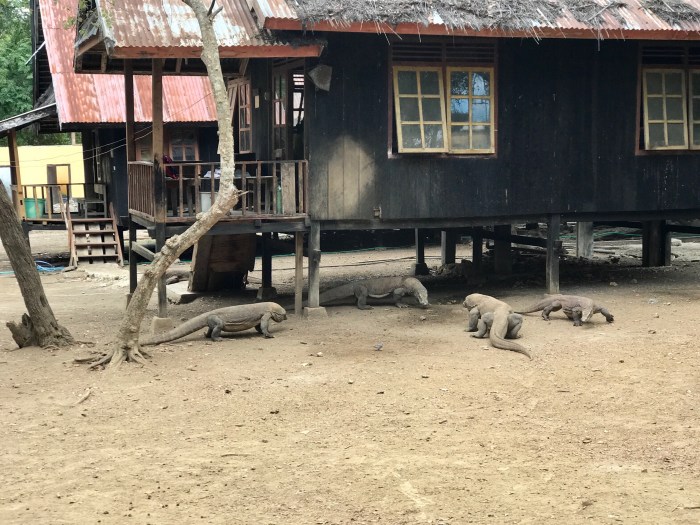 Wieder zurück kamen wir dann beim Haus vorbei, wo Essen für die Guides gekocht wird. Wir zählten da sage und schreibe ganze fünfzehn Komodo Warane, die sich da unter diesem Häuschen tummelten. Wie uns gesagt wurde, werden sie nicht gefüttert um den natürlichen Ablauf nicht zu gefährden, doch wir denken dass die Tiere schon mal ab und zu etwas kriegen, warum sonst sollten sie sich gerade dort aufhalten?