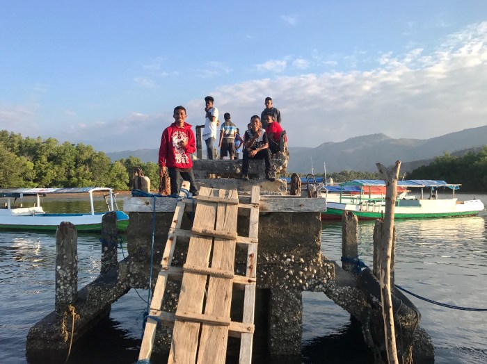 Am Abend dann, wenn die Sonne tief über dem Horizont steht, tuckern dann die typischen Fischerboote eines nach dem anderen mit dem typischen knat-knat-knat-knat-Geräusch in die ruhige Bucht ein. Bis zu fünfzehn Boote haben wir gezählt. Diese ankerten dann direkt vor uns. Es wurde dann gekocht und geplaudert und geschlafen. Früh am Morgen, aber noch lange vor Sonnenaufgang, knatterten die langen, schmalen, einzigartig bemalten Boote wieder aufs Meer hinaus, mit dem Ziel, Thunfisch zu fangen. Ein hartes Los in den leergefischten Gewässern Indonesiens.
