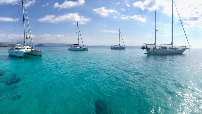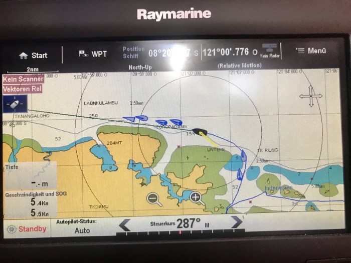 Es war eine Strecke unter Motor und um viele Inseln und Riffe herum. Auf unserem Plotter sahen wir überall in der Umgebung Rallyboote, die auch in der Gegend waren und teilweise den selben Plan hatten. Andere wiederum vergnügten sich seit Wochen in dem Gebiet mit Tauchen – es gibt ausserordentlich tolle Tauchgründe im Komodo Nationalpark!