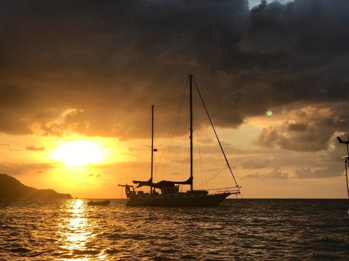 Viel war vom Untergrund nicht mehr zu sehen, das Wasser schaute dunkel aus und der Anker hielt beim ersten Versuch nicht. Also änderten wir den Spot, doch auch da war nicht besser – aber wir liessen es sein. Beim Gang ins Wasser sahen wir dass der ganz Grund voll mit Korallengeröll war, keine Chance dass der Anker hält! Im Guide stand, der Grund sein Schlamm… Aber es war in Ordnung für eine Nacht.