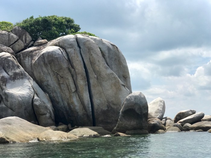 Wir freuten uns auf Belitung. Die Bilder die wir im Vorfeld sahen, sahen vielversprechend aus! Grosse, runde Granitfelsen ragten überall wie Skulpturen aus dem klaren, hellen Wasser. Ein richtiges Fotografen-Paradies! Wir erreichten die Insel am späteren Nachmittag und es zeigte sich, dass wir uns nun in Äquator Nähe befinden – das Wetter ändert sich ständig und tagtäglich gehen starke Regenfälle über der Insel nieder. Die Kinder erwischten noch einen sonnigen Moment, wo sie mit Amanda, einer jungen Frau vom Boot «Angel Wings» auf eine Unterwasser Exkursion gehen konnten. Es schwammen gigantisch grosse Quallen durchs Wasser. Diese weisslichen Quallenmonster hatten einen Durchmesser von einem halben Meter! Es gab in der nahen Umgebung auch ein paar Riffe und Amanda kannte sich super gut aus, mit allem Getier welches unter Wasser zu sehen ist. Und so sahen sie zudem Garnelen, Nudibranches, Lionfish und eine Moräne.