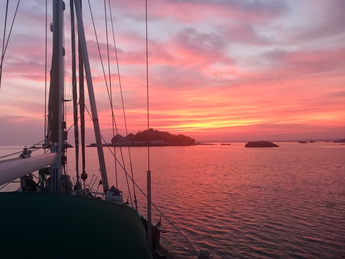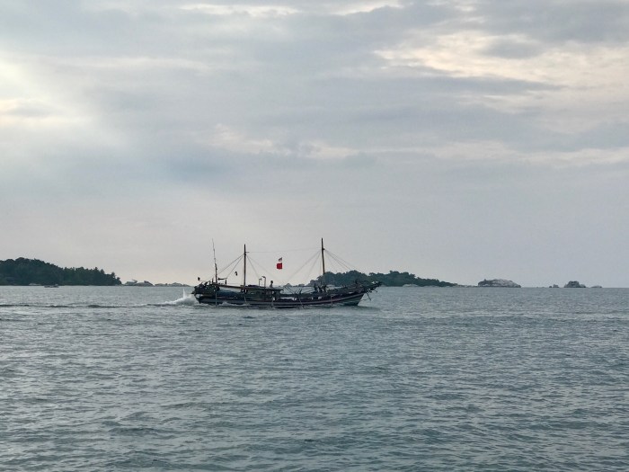 Irgendwann im Verlaufe des Tages nahm der Wind wieder ab und wir mussten den Motor einschalten. Es wurde Nacht und es war fast immer noch heiss. Während meiner Wache trat plötzlich, von einer ganz anderer Richtung als normal, ein kalter Luftzug an mir vorbei. Ich war gewarnt. Der Wind wurde heftiger und der Versuch meinerseits, mit kleinsten Segeln einen Teil des unterdessen über 30 Knoten starken Windes zu erhaschen, scheiterte. Dieser drehte uns auf die Nase und unterdessen setzten auch starke Regenfälle ein. Es waren auch rings um uns Rally Boote und Fischerboote verteilt, die Sicht war miserabel wir mussten gut aufpassen. Alles in Allem war es kein grosser Deal für uns, alles war unter Kontrolle, ausser dass es uns bei einer Böe das Solar Pannel gedreht hatte. Andere von uns Seglern hatten weniger Glück und zerrissen im Sturm ihre Segel. Das Unwetter dauerte lange an. Die pinkfarbene Wolke auf unserem Radar zeigte den Regen an und die Wolke hielt für Stunden auf unserm Bildschirm an. Am Morgen danach war alles wieder ruhig – zu ruhig – den Rest der Strecke, also weitere 24h gab es keinen Wind mehr bis nach Belitung.
