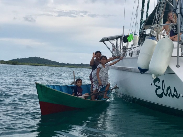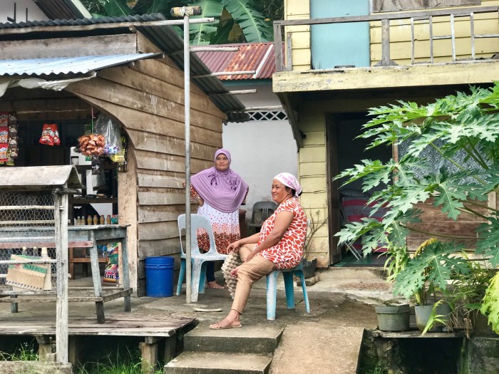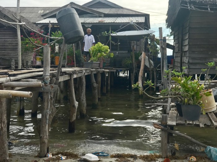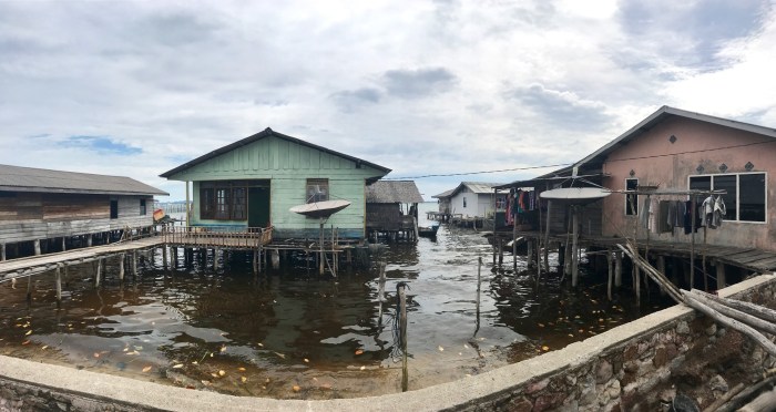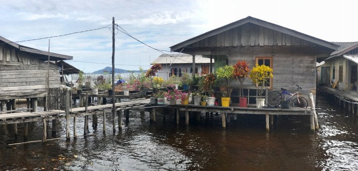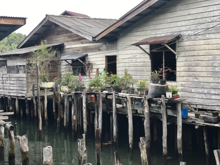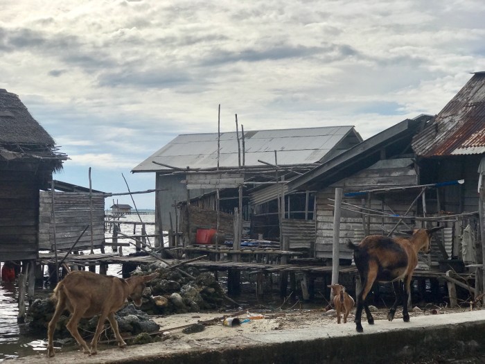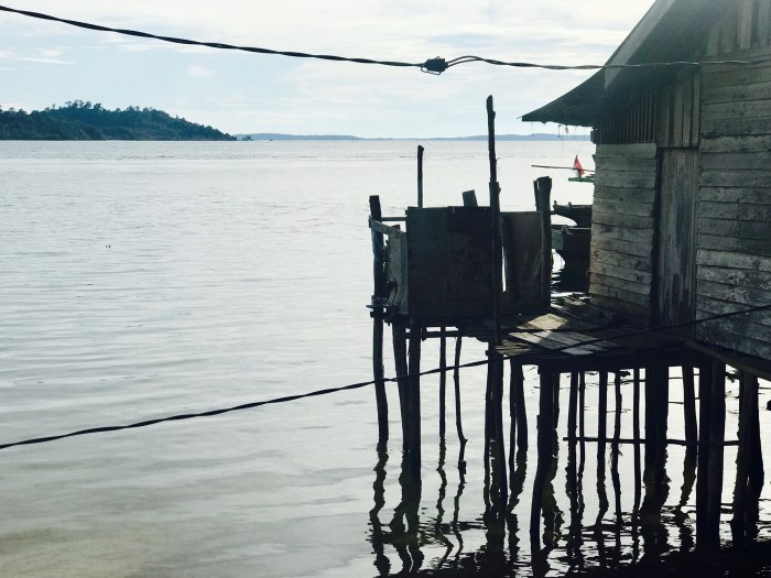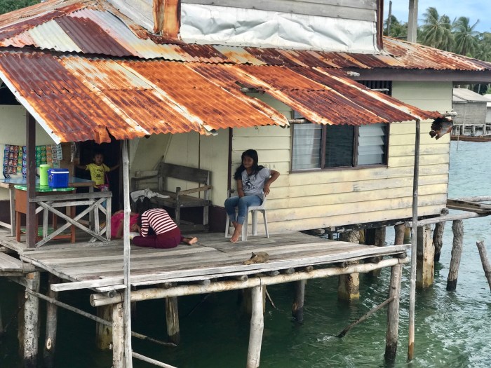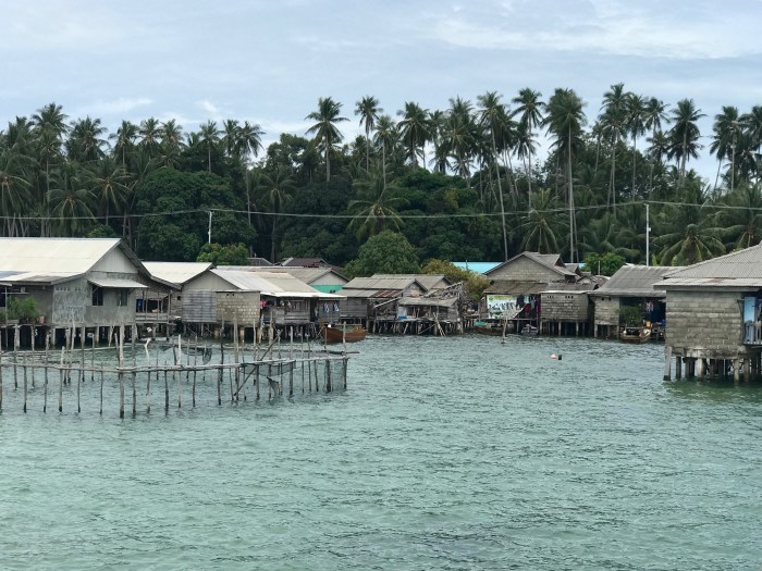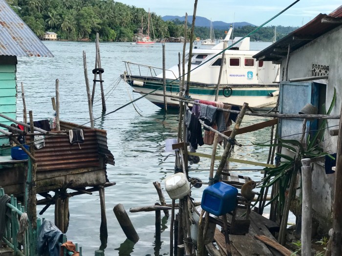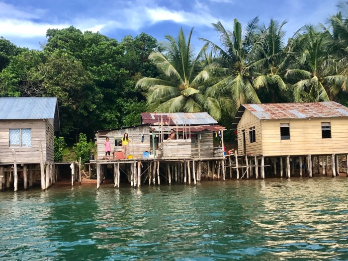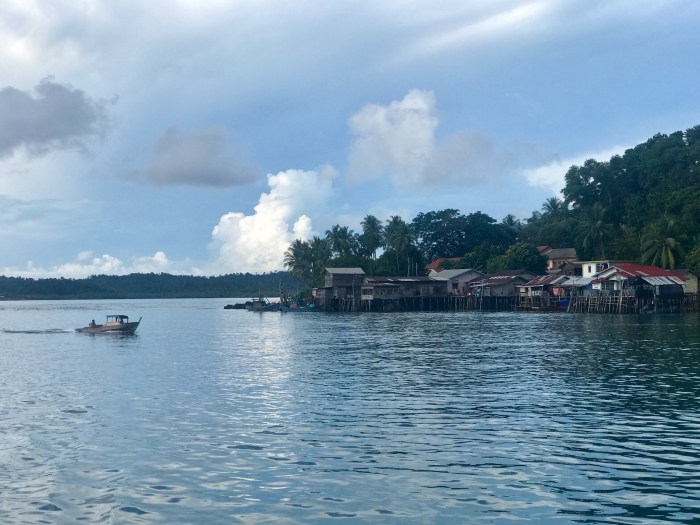 Wir kamen diesmal einen Tag früher an, zwei Boote waren in dem gebogenen Kanal schon vor Anker. Wir waren ein wenig erstaunt, wo wir da gelandet waren: Wir ankerten in einem Kanal der durch die vorgelagerte Insel entstand. Und auf beiden Seiten gab es Häuser auf Stelzen. Auf der einen Seite war das kleine Dorf und auf der anderen, der Inselseite, nur ein paar Häuser. Beim Ankommen beobachteten wir gerade vier Frauen in einem runden Steinkreis, nahe am Ufer ihre Wäsche und sich selbst zu waschen. Es war ein super kleiner Ort auf einer kleinen Insel. Die Landschaft war nicht einladend mit Stränden ect und das Wasser so nahe an der Siedlung nicht einladend zum Baden. Schon bereuten wir ein wenig, nicht noch in «Banka», das eigentlich auf dem Weg gelegen war, zu stoppen. Doch nun waren wir da!