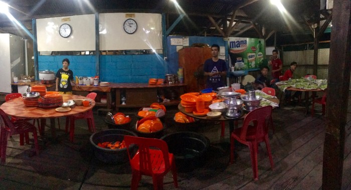 Das Restaurant befindet sich auf über dem Wasser und ist auf Stelzen gebaut, gegessen wird aus Plastikgeschirr