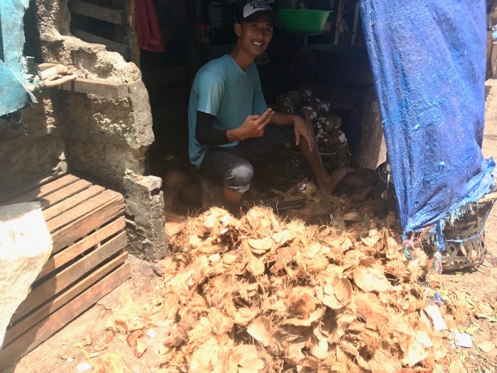 Kokosnüsse werden auf der Strasse aufgeschlagen, bezw geschält