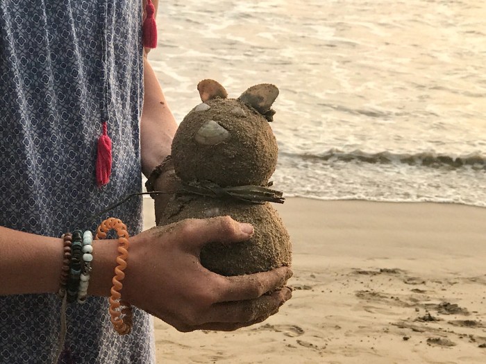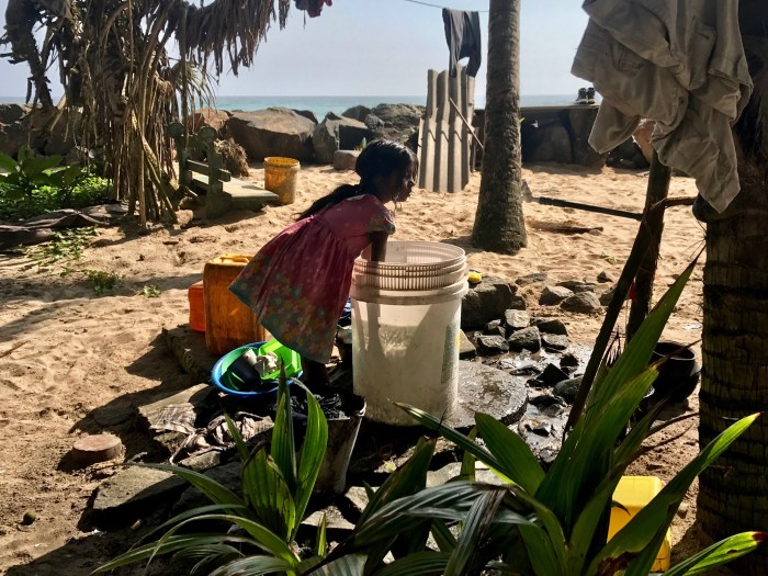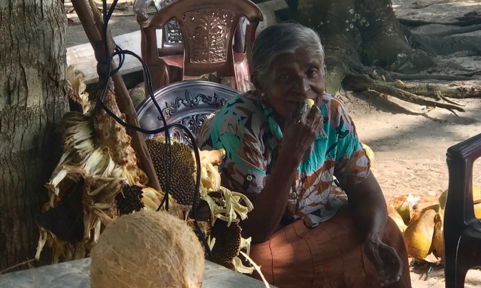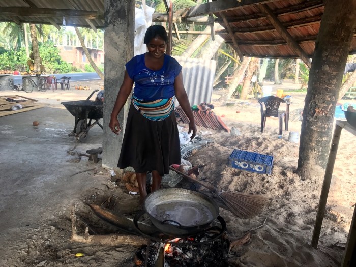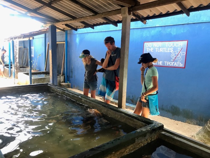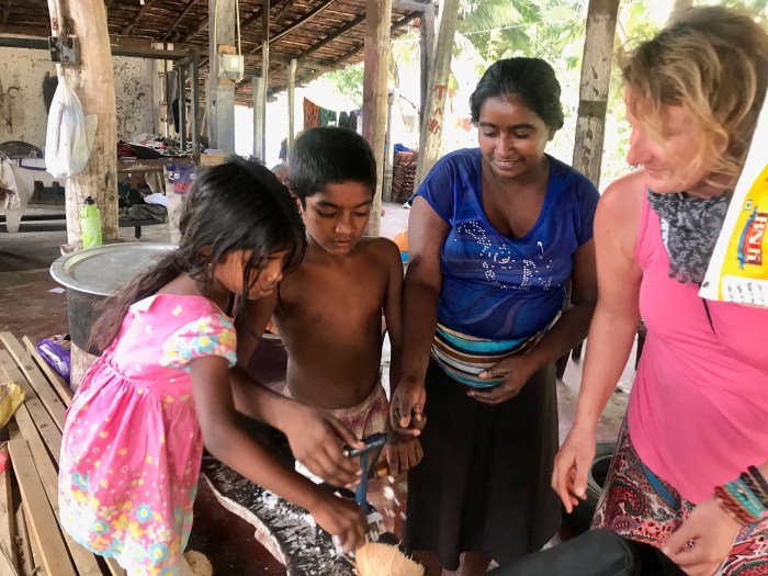 Wir besuchten an einem andern Tag eine Wasserschildkröten-Notstation, wo verletzte Schildkröten aufgepäppelt werden und Junge aus den Eiern schlüpfen. Auf dem Nachhauseweg, wir liefen den Strand entlang und teilweise an der Strasse, kamen wir an einem zerfallenen Haus vorbei, wo eine Familie Kokosnüsse verarbeitete und verkaufte. Diese Menschen waren so herzlich und interessiert, wir kamen ins Gespräch, sie zeigten uns wie sie Kokosnuss Öl produziere und wir zeigten ihnen viele Bilder von unserer Reise auf dem Handy! Wir sollten am Abend zum Essen kommen und in ihrem Haus schlafen… Die Begegnung war eine grosse Freude! Diese Familie hat beim Tsunami ein Teil des Hauses verloren und leben nun in der Ruine. Diese Familie strahlte so viel Fröhlichkeit aus!