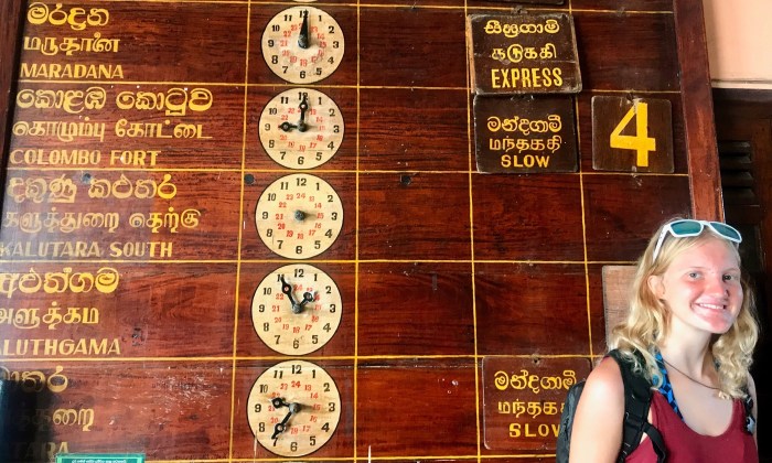 Die antike Fahrplantafel im Bahnhof Galle. Wir nehmen den Zug nach Colombo