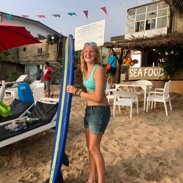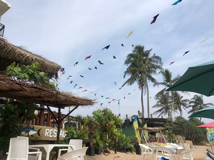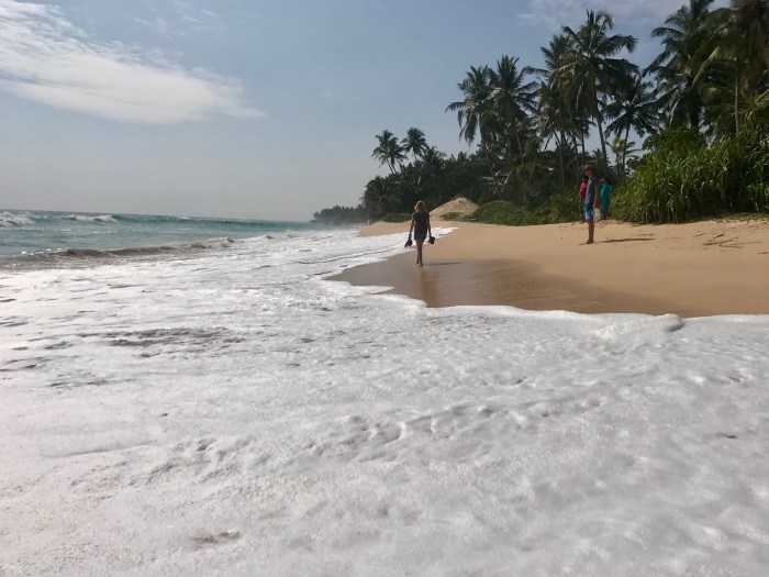 Auch in Kandy trafen wir es gut, so gut dass wir uns entschieden, auch dort zwei Nächte zu verbringen. Wir hatten uns schon an den Standart gewöhnt – ein schönes Badezimmer, Ventilator und sogar Wifi und eine nette Hausherrin. In Ella machte dann unsere «Zimmersuche-Erfolgskurve» einen steilen Abstieg! Wiederum mit Air BnB gebucht mussten wir uns zu unserm Zimmer, am Ende des Dorfes, an einem steilen Hügel mit fast unpassierbarem Zugang zum Haus, führen lassen. Das Haus war noch nicht fertig gebaut und überall waren alte Baustellen. Das Zimmer schäbig, im Badezimmer hielt man den Dusche Knopf auf einmal in den Händen und das Wasser spritzte heraus von allen Seiten! Und es war kalt in Ella – doch dafür konnte unser Gastgebern natürlich nichts! In Badulla gab es kein Air BnB und so suchten wir auf gut Glück nach einem Zimmer. Wir fanden auf Anhieb eines und der Preis war auch gut – wir bezahlten für alle unsere Übernachtungen bis auf das Erste, nur 30 Chf für ein Zimmer mit vier Betten! Doch mitten in der Nacht startete unser Vermieter sein Tuck Tuck direkt neben unserem Fenster, das offene Lamellen hatte. Der Lärm war ohrenbetäubend! Zudem regnete es die ganze Nacht hindurch in Strömen und der Regen tropfte lärmend auf das Blechdach. Die «Zimmersuche Erfolgskurve» stieg dann rapide in die Höhe, wenn nicht auf das Maximum, als wir ein Zimmer in Mirissa suchten. Zwar lag unser Heim ein wenig versteckt an einem schmalen ruhigen Weg im Grünen, inmitten von den Häusern der Einheimischen, doch das Gebäude war nigelnagelneu! Die Zimmer waren schön und mit viel Stil designed und gebaut, wir fühlten uns pudelwohl.