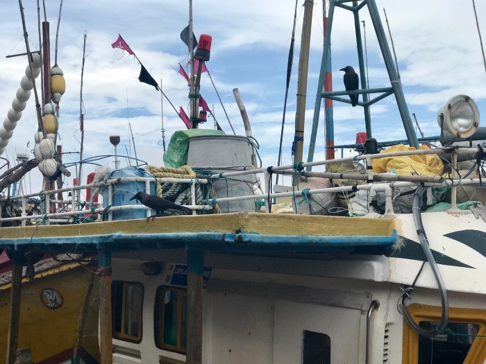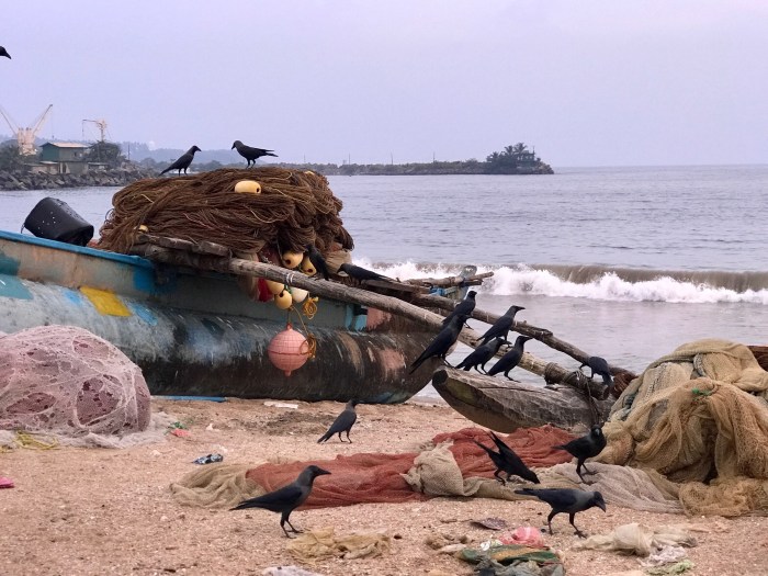 Viele Tuk Tuks, diese lustigen dreirädigen Fahrzeuge, und die laut hupenden Busse zogen an uns auf der Strasse vorbei. Wir kamen am Fischmarkt am Strand vorbei, wo viele schwarze Raben auf die Reste warteten und wir die wiederum besonderen sri lankischen Boote zu sehen bekamen. Natürlich waren wir vorerst mal auf der Suche nach einem Bankomat und dann, nach einem Supermarkt – wir waren nämlich nach den neun Tagen auf See ziemlich ausgegessen!